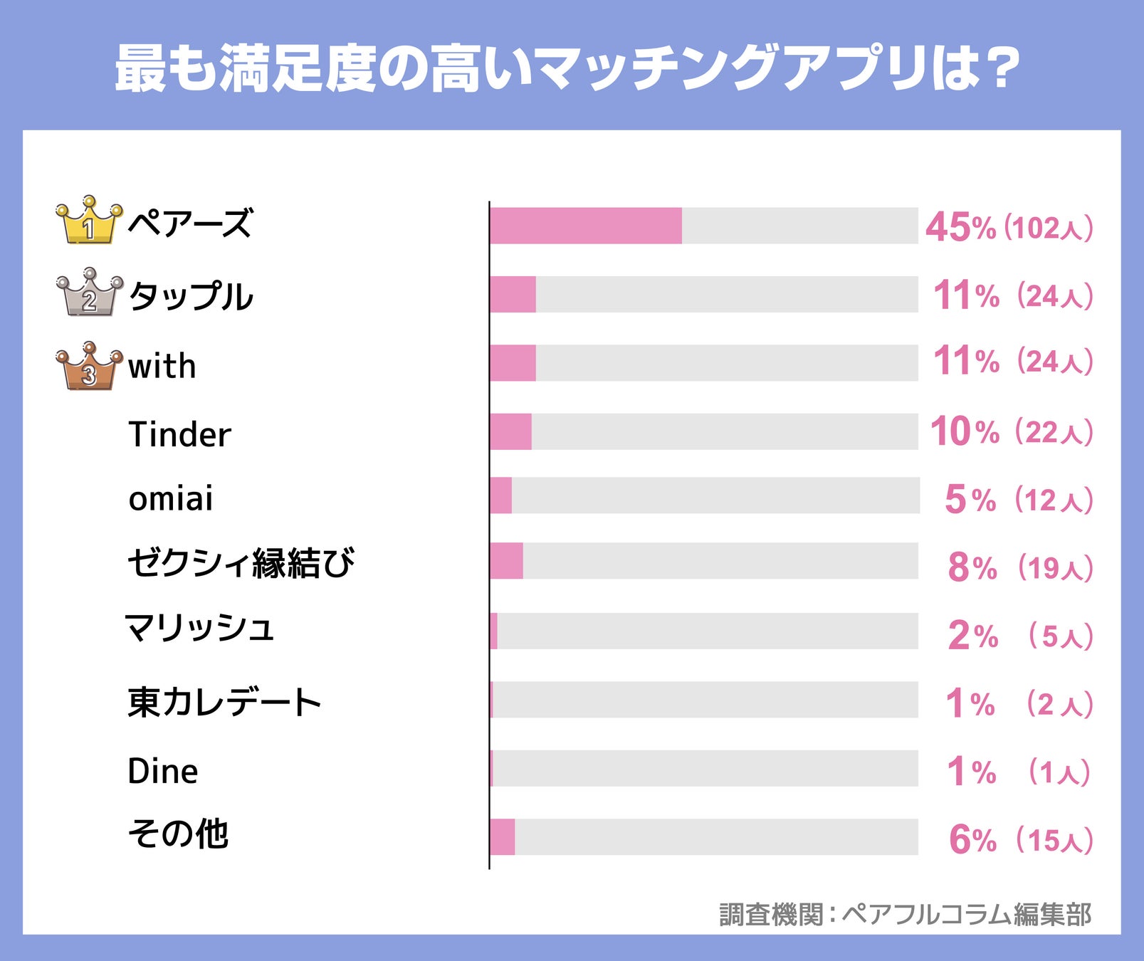 マッチングアプリに関する意識調査をした結果、最も利用されているアプリは「ペアーズ」だとわかりました。