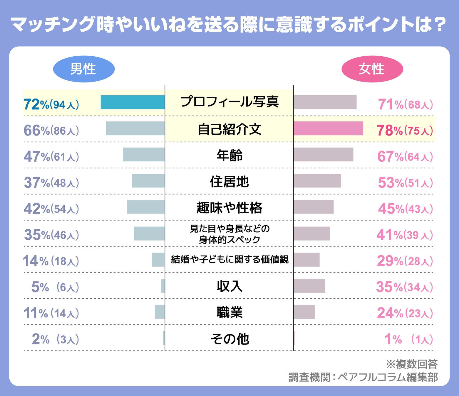 マッチング時やいいねを送る際、男性は「プロフ写真」女性は「自己紹介文」を意識しています。