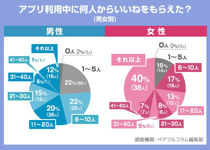 女性の場合、50人以上の男性から「いいね」をもらったという回答が最も多いです。競争相手が多いため、男性が女性の目に留まるには、他のユーザーとの差別化を図るのが重要だと考えられます。