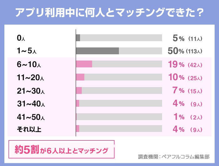 アプリ利用中にマッチングした人数についてのアンケートを取ったところ、利用者の約5割が6人以上とマッチングできたと回答しました。また、マッチングできなかった人は僅か5%しかいないため、多くの利用者が実際にマッチングできているのがわかります。