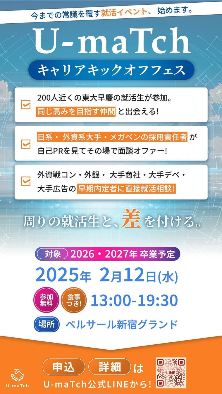 株式会社AUTLA(U-maTch)は、2025年2月12日(水)に「U-maTchキャリアキックオフフェス vol.1」を開催します。参加予定学生は27卒中心の東大早慶一橋生150人、参加企業は大手企業から今急成長中のベンチャーまで多岐に渡る10社程度の予定です。