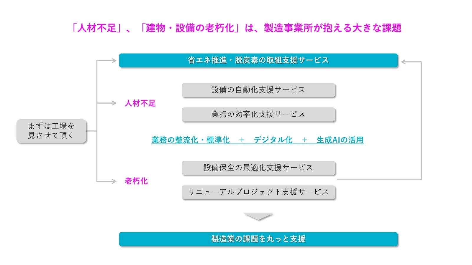 具体的に、ムダレスは空調設備などのファシリティ設備の診断・分析から今後の設備更新・機能維持計画を立案・実行する省エネサービスの提供を始めとし、DX化を通じての生産革新を支援、その他脱炭素に関わるサービスの提供を行うことで、製造業の課題を丸(まる)っと支援いたします。