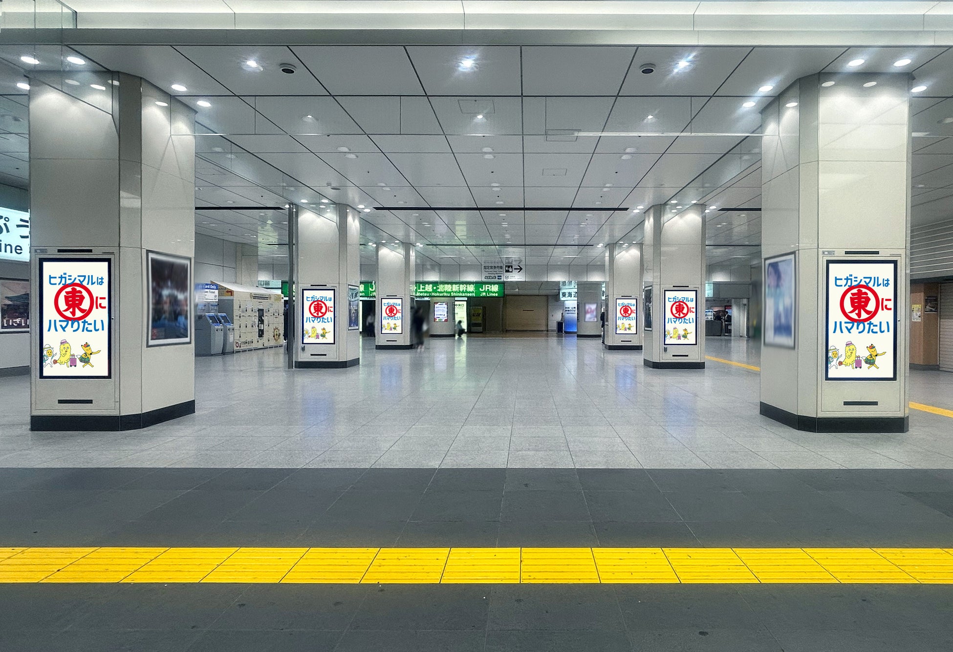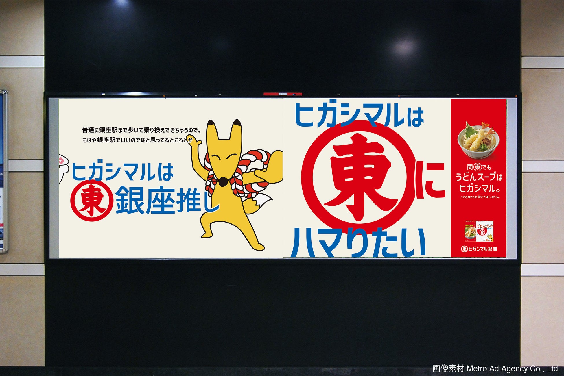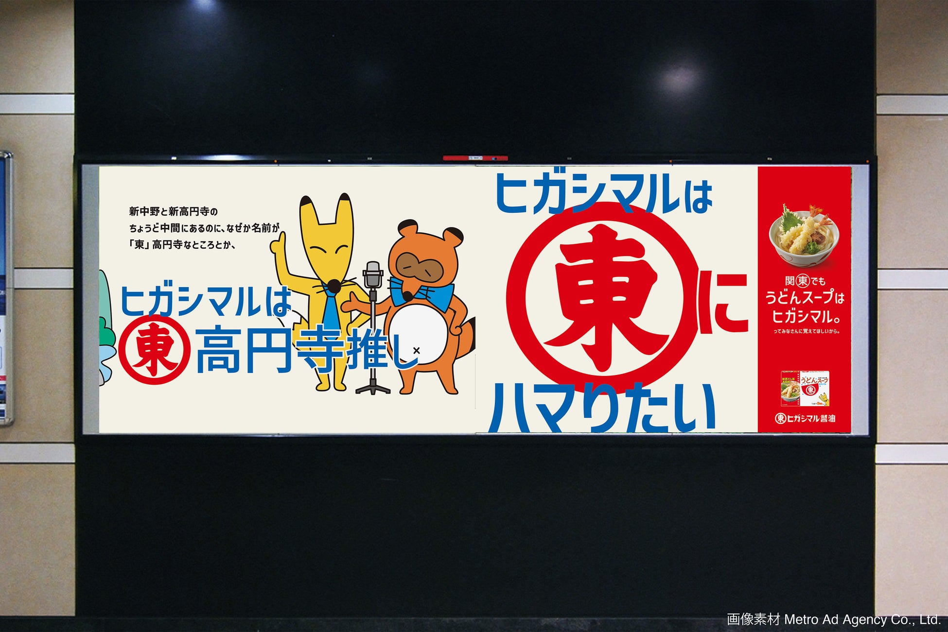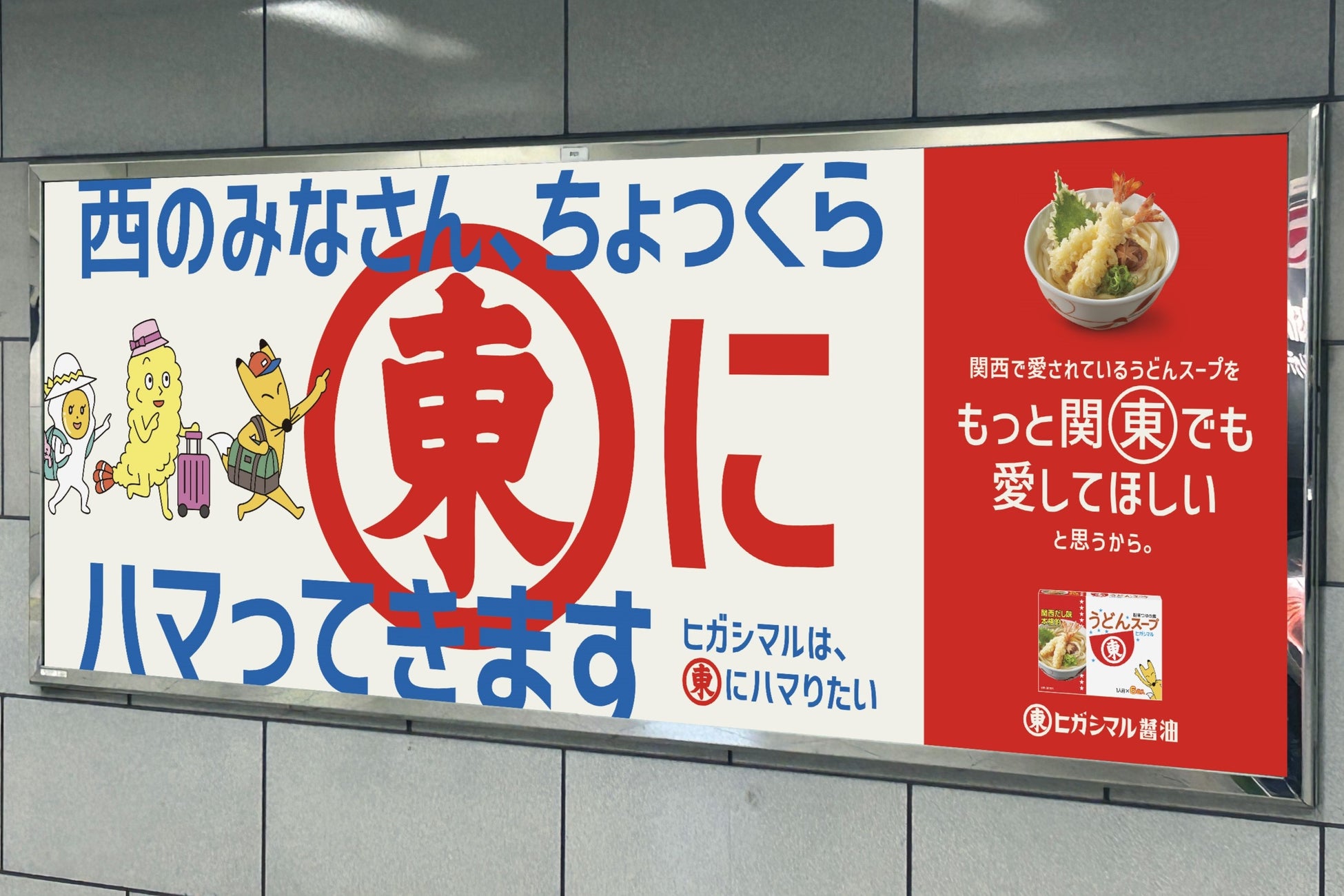 社名にちなみ、東京都内の“東(ひがし)”から始まる全ての駅(28ヵ所)をはじめ、東京駅や大阪・西梅田駅にポスターや電柱広告などを掲出しました。“東(ひがし)”から始まる全28駅に掲出したポスターなどでは、「うどんスープ」のCMで活躍しているキャラクターたちが各エリアならではのモチーフを取り入れたご当地バージョンに変身し、登場しています。