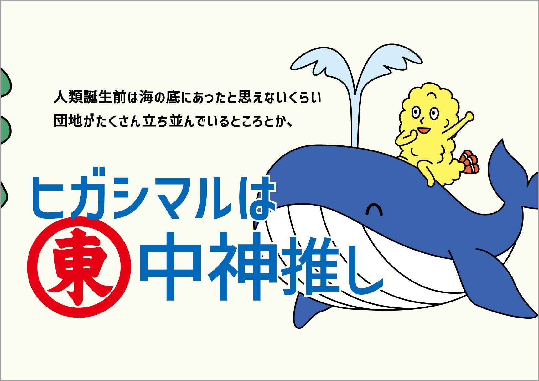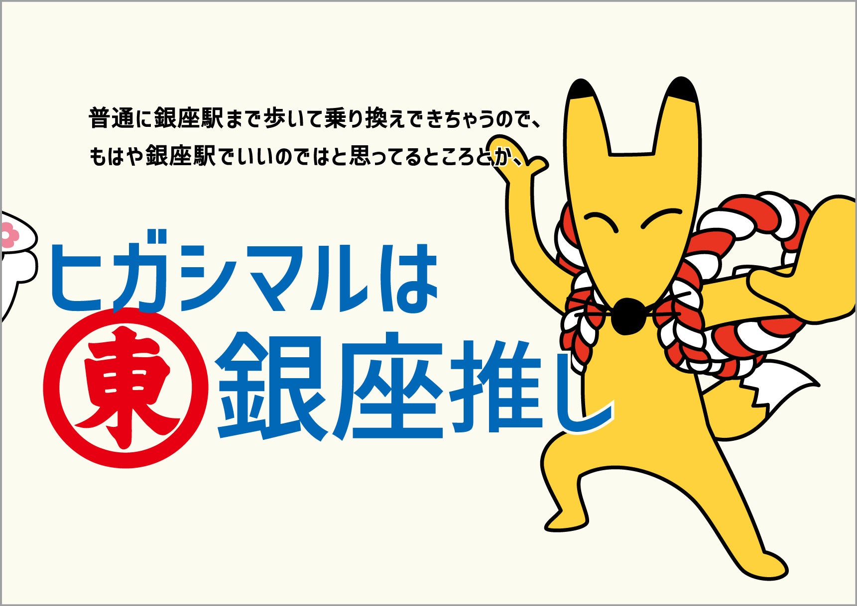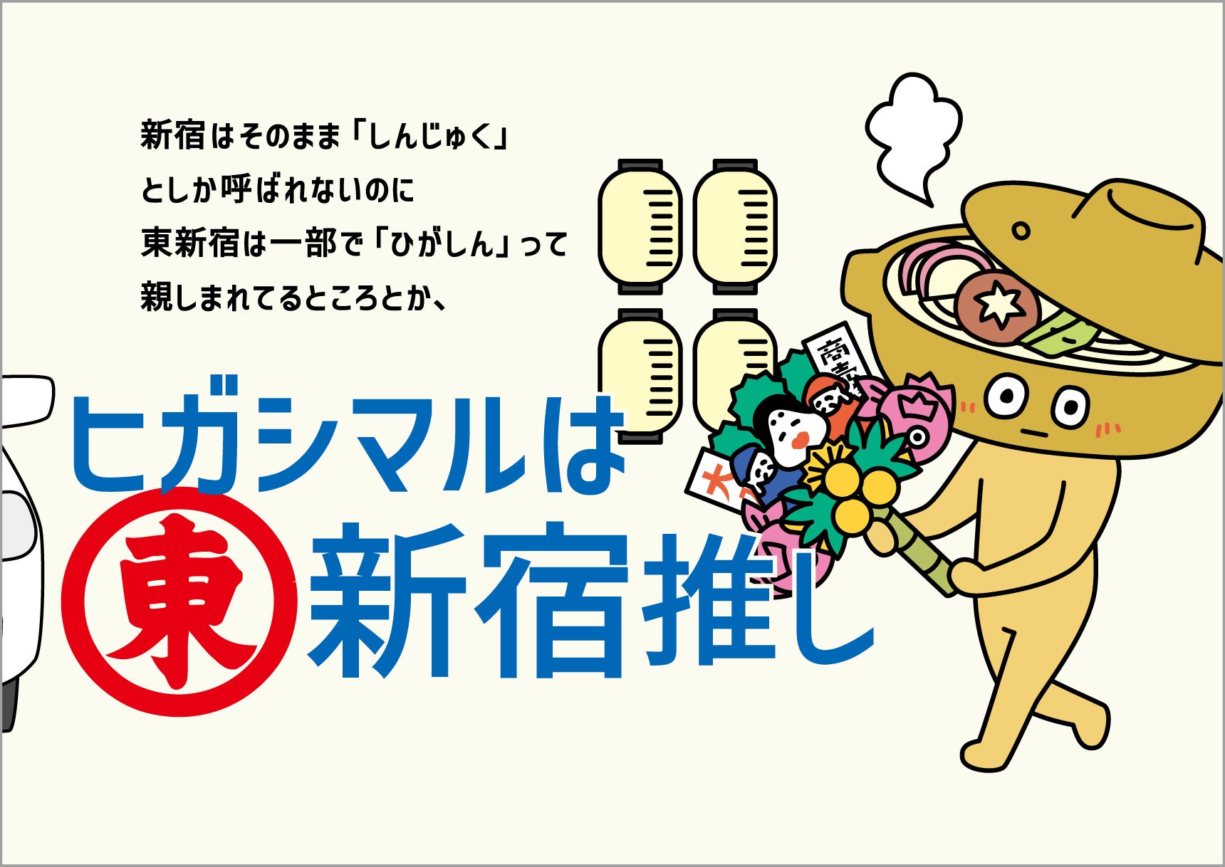 そこで60周年を盛り上げるべく、本作戦を実施。関東で「うどんスープ」をさらに広めるために、 社名「ヒガシマル」にちなんだ東京都内の“東(ひがし)”から始まる全28駅周辺エリアがピッタリの場所と考え、長年CMで活躍しているキャラクターたちを出張に送り出しました。西は埼玉目前の「東青梅」駅、東はあと10kmほどで千葉という立地の「東大島」駅まで、キャラクターたちが各エリアならではのモチーフを取り入れたご当地バージョンに変身し、ポスターなどに登場します。