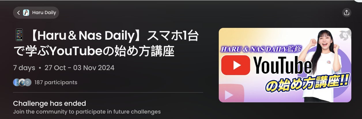 Haru Dailyさん:https://nas.io/haru-daily/challenges/harunas-daily1youtube