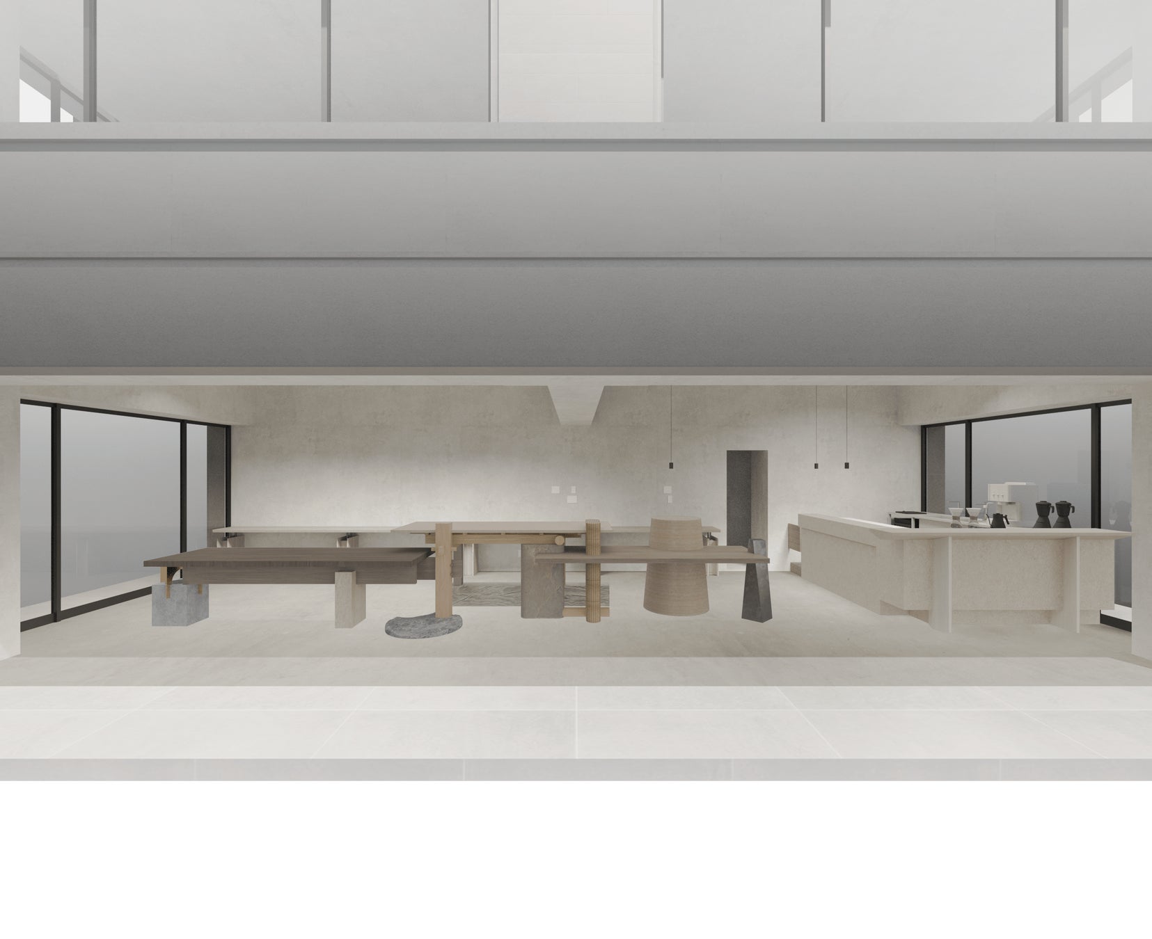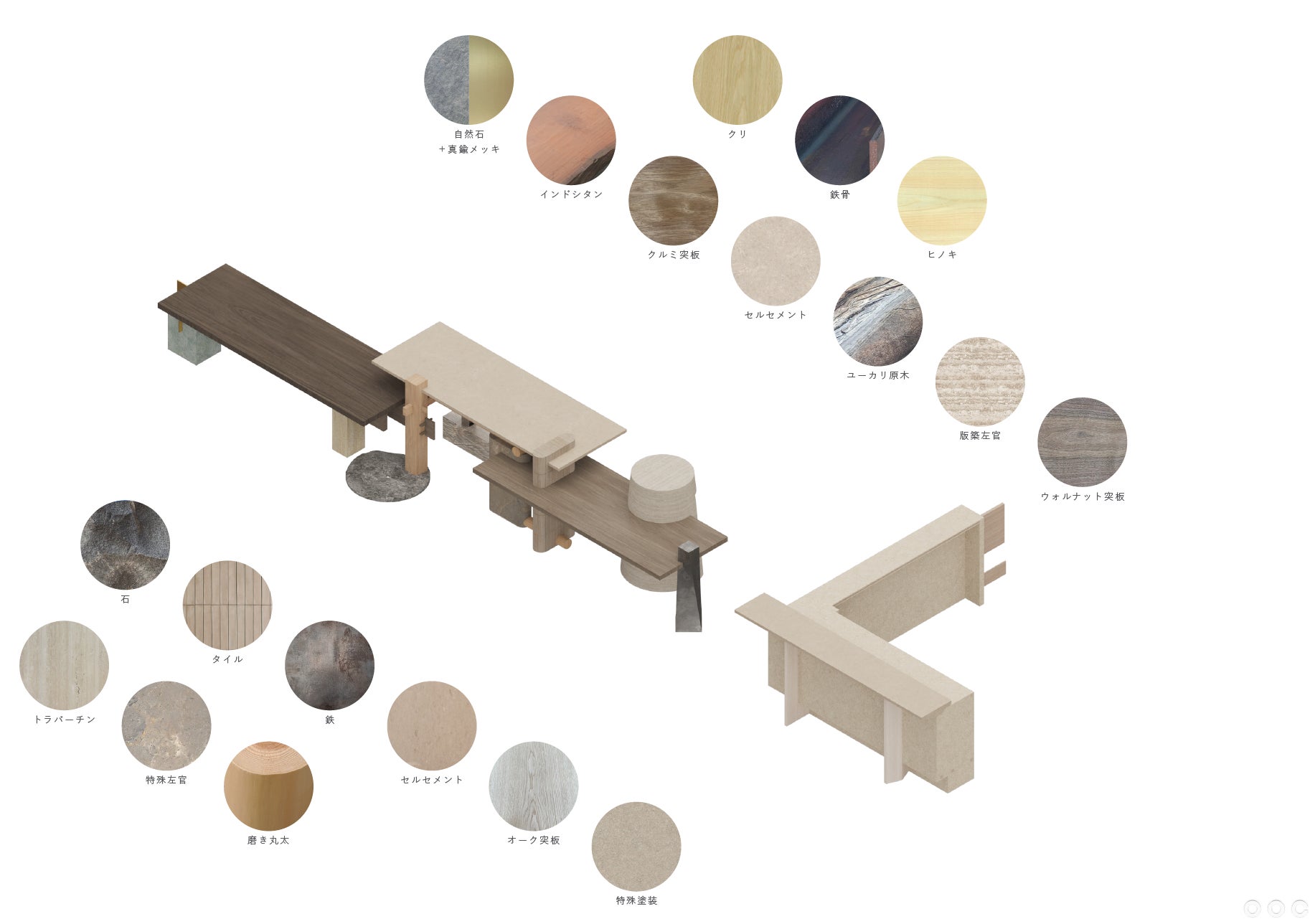 「o」のコンセプトは、物や概念が自由に併置され、新しい原点へ統合しながら分散する場であることから、脈絡のないオブジェを偏在させ、マテリアルを実験的に割り当てました。それらを台座に、家具として構造化するために天板によって統合しました。