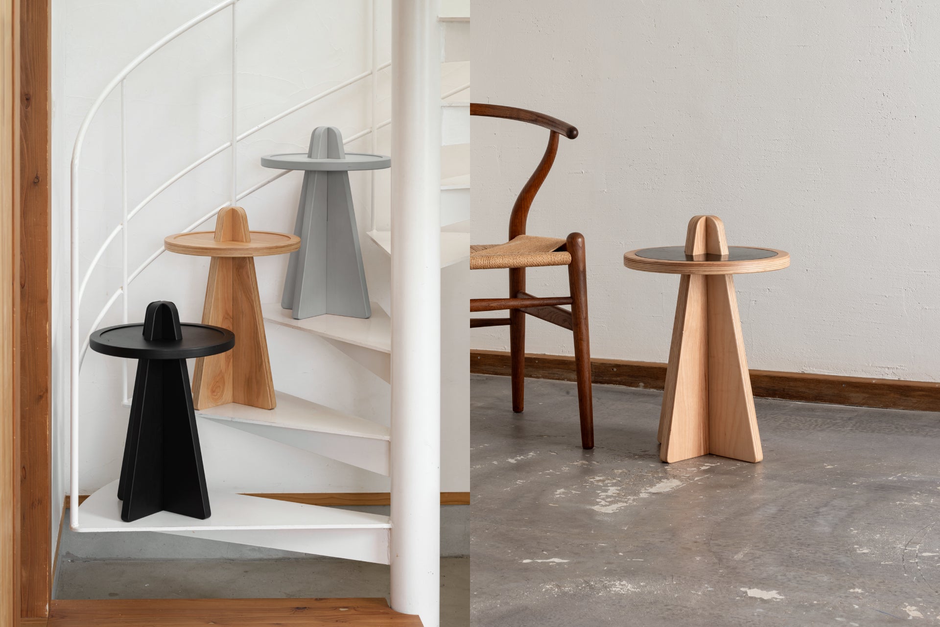 DISC TYPE - ONE は、ディスクと呼ばれる天板の✕型開口部に、2枚の台形プレートを組み合わせた脚部を差し込むことで、アイコニックな突起部が出現しサイドテーブルが完成します( 特許庁 / 意匠権の登録済み )
