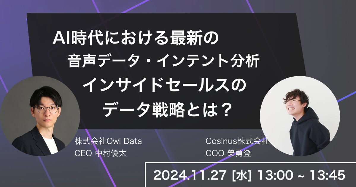 AI技術の進展により、営業のアプローチは変革を遂げつつあります。このたび、オウルデータ株式会社とコシニアス株式会社共催にて、音声データ解析とインテント分析を活用した最新のインサイドセールス戦略をテーマにウェビナーを開催します。