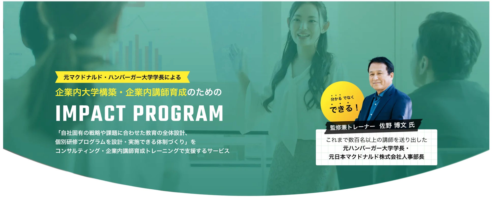 企業ニーズに合わせ、企業内大学構築コンサルティング、講師育成に特化したプログラム、スキル習得を目指すピンポイントプログラム等から選択可能です。詳細は以下のホームページでご確認いただけます。https://impact-program.studio.site