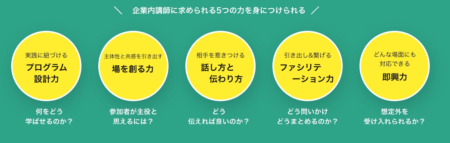 企業内講師に求められる力を5つの力へ分解。この5つの力をグループレッスンのみならず、オンライン個別レッスン・カウンセリング・伴走支援で一人一人の「できる」を徹底サポート。