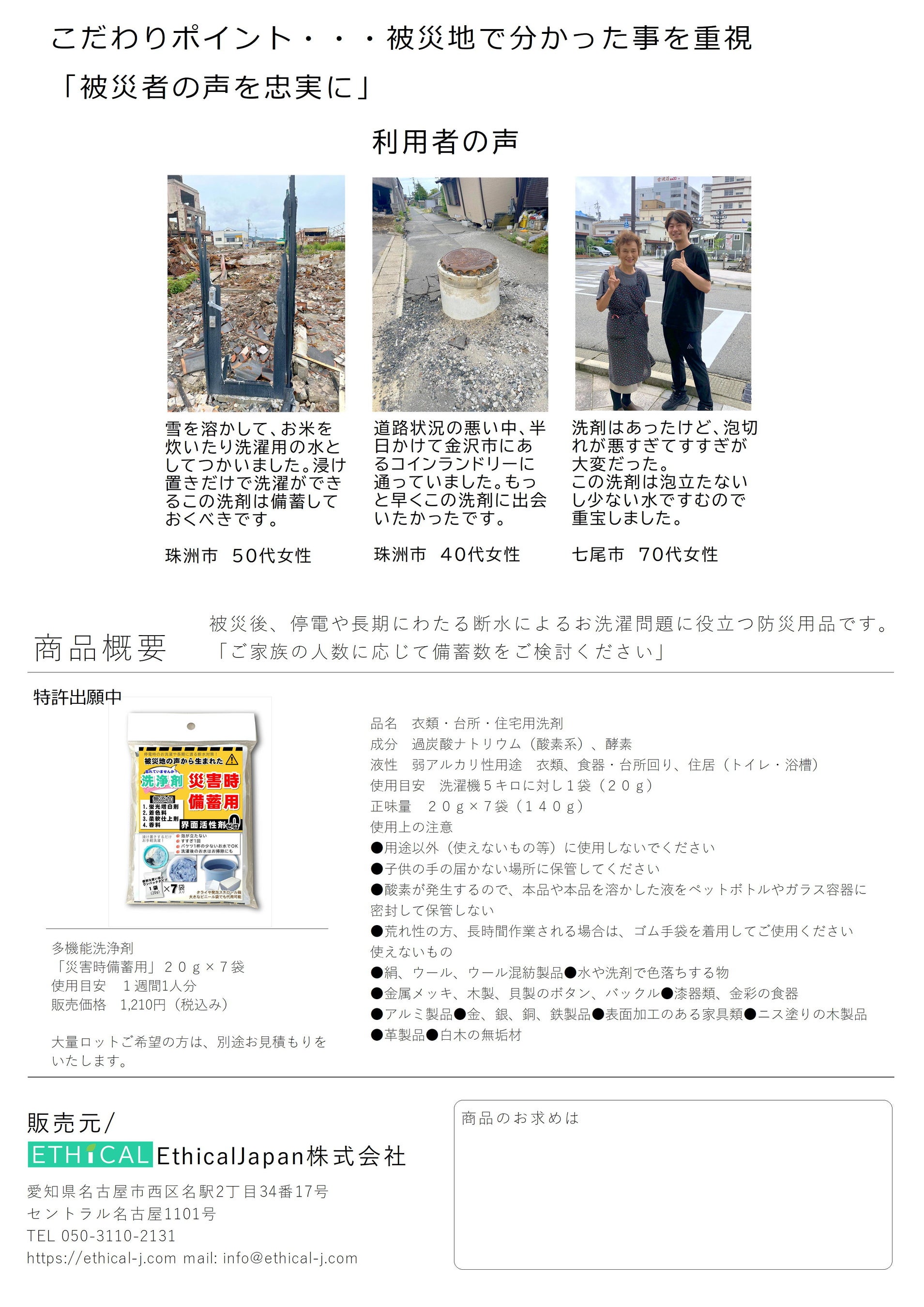 「災害時備蓄用多機能洗浄剤」URL: https://ethical-j.com/tenkamusou
