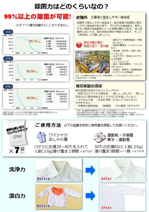 能登半島地震復興支援ボランティアを通じ、被災地の方々の声で多かったのが「洗濯問題」一般的な家庭用洗剤では大量の水を使うため断水地域では、雪解け水や川での洗濯を余儀なくされ車移動が可能な被災者は何時間もかけ被害の少なかった地域へ洗濯をしに行っていたという事実を知った。少量の水でつけ置きするだけ、繰り返し使用でき残り水で掃除、除菌も可能。環境に配慮し無添加とすることで誰でも安全に使用することができる。BCP対策としても、感染症対策(除菌)ができる商材であるので、企業、自治体での備蓄の需要を見込み開発に至った。
