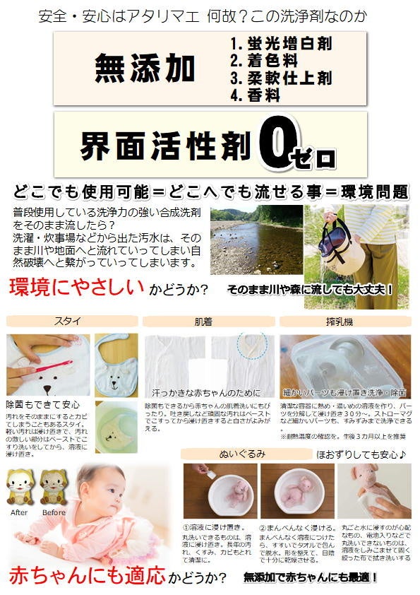 少ないお水でお洗濯が可能、界面活性剤ゼロの洗剤を実現!蛍光増白剤、柔軟仕上剤、着色料、香料無添加。酸素と酵素のチカラで頑固な汚れや臭いを落とします。