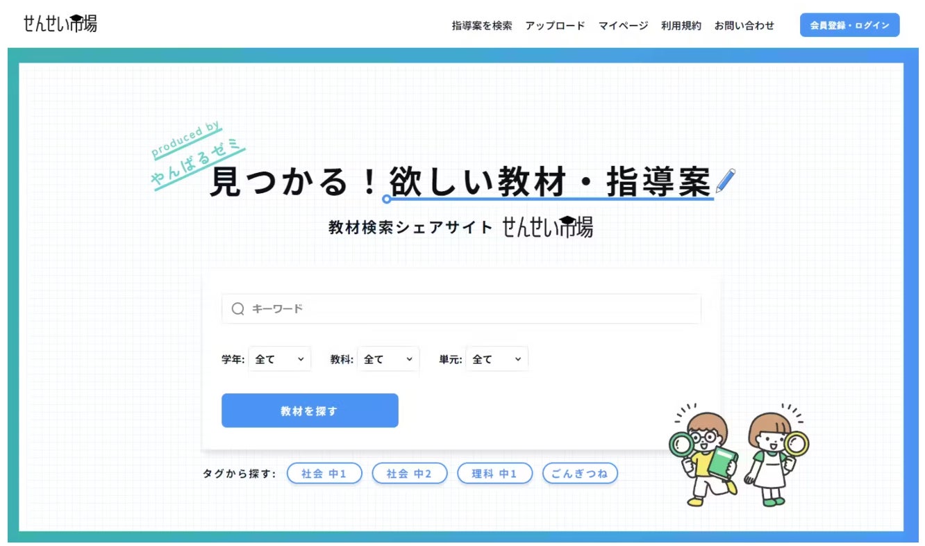 「せんせい市場」は、先生の考えた教材や授業のアイデアを投稿するシェアサイトです。現在全国からたくさんの先生たちにご協力いただき、1000件以上の授業のアイデアが集まっています。