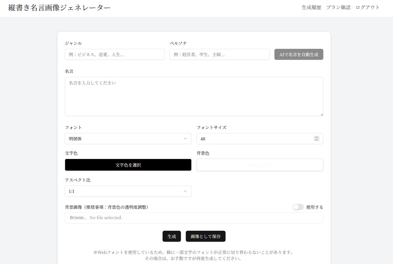 シンプルなUIで、手動で画像内に名言を入力することも、AIで自動的に生成された名言を使用することも可能です。