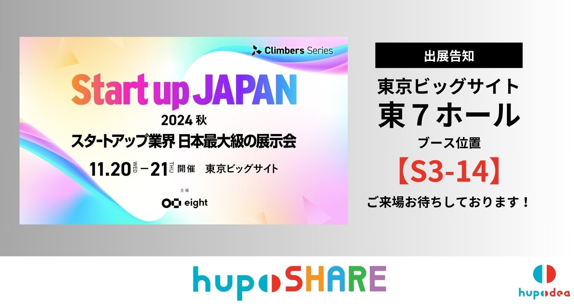 株式会社hupodea(本社:兵庫県神戸市、代表取締役:奥島輝也)は2024年11月20日(水)、21日(木)に東京ビッグサイトで開催される「Climbers Startup JAPAN EXPO 2024 - 秋 -」に、出展することをお知らせいたします。