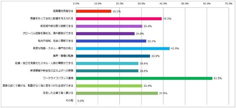 ● 働き方には、激務を避けワークライフバランスの重視を求めている方が多い一方で、キャリア形成には高度な知識・スキル・専門性の向上を求めている方も多い