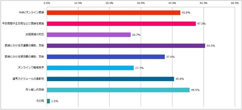● 選考においては、オンライン面接や柔軟な面接日程の調整を希望し、対面での面接では交通費の補助を期待する傾向