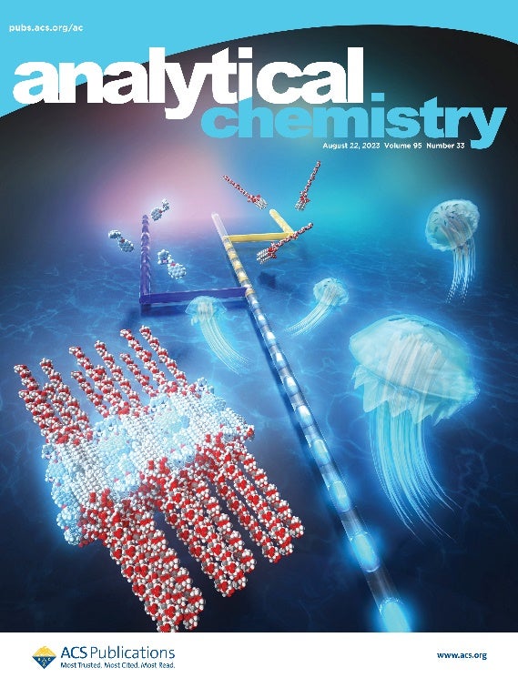 そこで当社は上智大学との共同研究により、エンドトキシンと迅速に反応して光を発する非生物由来の蛍光剤の開発に成功しました(図1)。この蛍光剤と蛍光剤が発する光を検出する流れ分析装置を組み合わせることで、1時間に36サンプルの自動高速測定が可能なエンドトキシン分析方法を開発いたしました(図2)。本研究成果はアメリカ化学会のAnalytical Chemistry誌に2023年7月31日付でオンライン上に公開され、Supplementary Coverに選出されました(図3)。本内容は2023年8月3日付で上智大学からもプレスリリースされております(https://www.sophia.ac.jp/jpn/article/news/release/20230803/)。この研究成果を基にエンドトキシンモニターの試験機(図4)を製作し、注射用水をサンプルとした実証試験を2024年11月より開始しました。本エンドトキシンモニターのターゲット価格は3,000万円(税抜き)を予定しておりますが、今後の仕様変更に伴い予告なく変動する場合があります。このエンドトキシンモニターを注射用水製造システムに導入することにより、迅速な異常検知が可能になると共にエンドトキシン分析に伴う人手やコストの大幅な削減が期待されます。