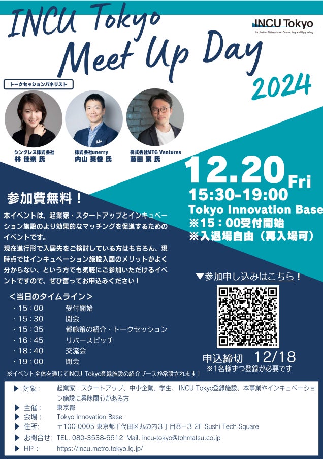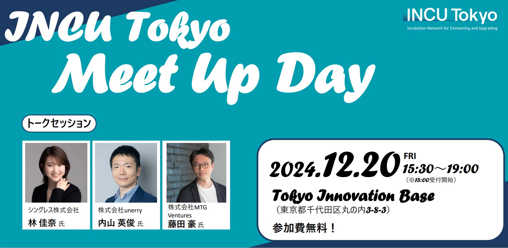 インキュベーション・コミュニティ「INCU Tokyo」運営事務局は、12月20日に東京・丸の内で、起業家・スタートアップと、コミュニティに参画するインキュベーション施設を繋ぐミートアップイベント『INCU Tokyo Meet Up Day』を開催いたします。