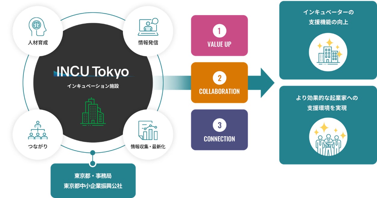 東京都は、都内インキュベーション施設による支援機能の向上により、施設に入居する起業家への支援の質を高め、起業家の裾野拡大及び成長を強く後押しするため、今年度よりインキュベーターを中心とした連携コミュニティの構築を進めています。