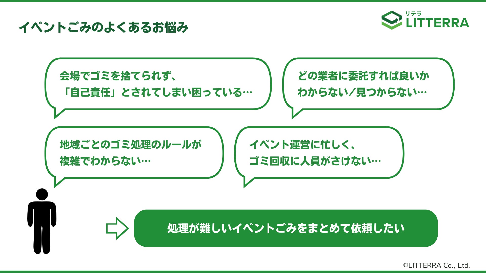 株式会社LITTERRA(本社:東京都渋谷区、代表取締役:石井翔己)は、2025年1月23日、対応・処分が難しいイベントごみをまるっと依頼できるイベントごみコンサルティング事業をローンチしました。