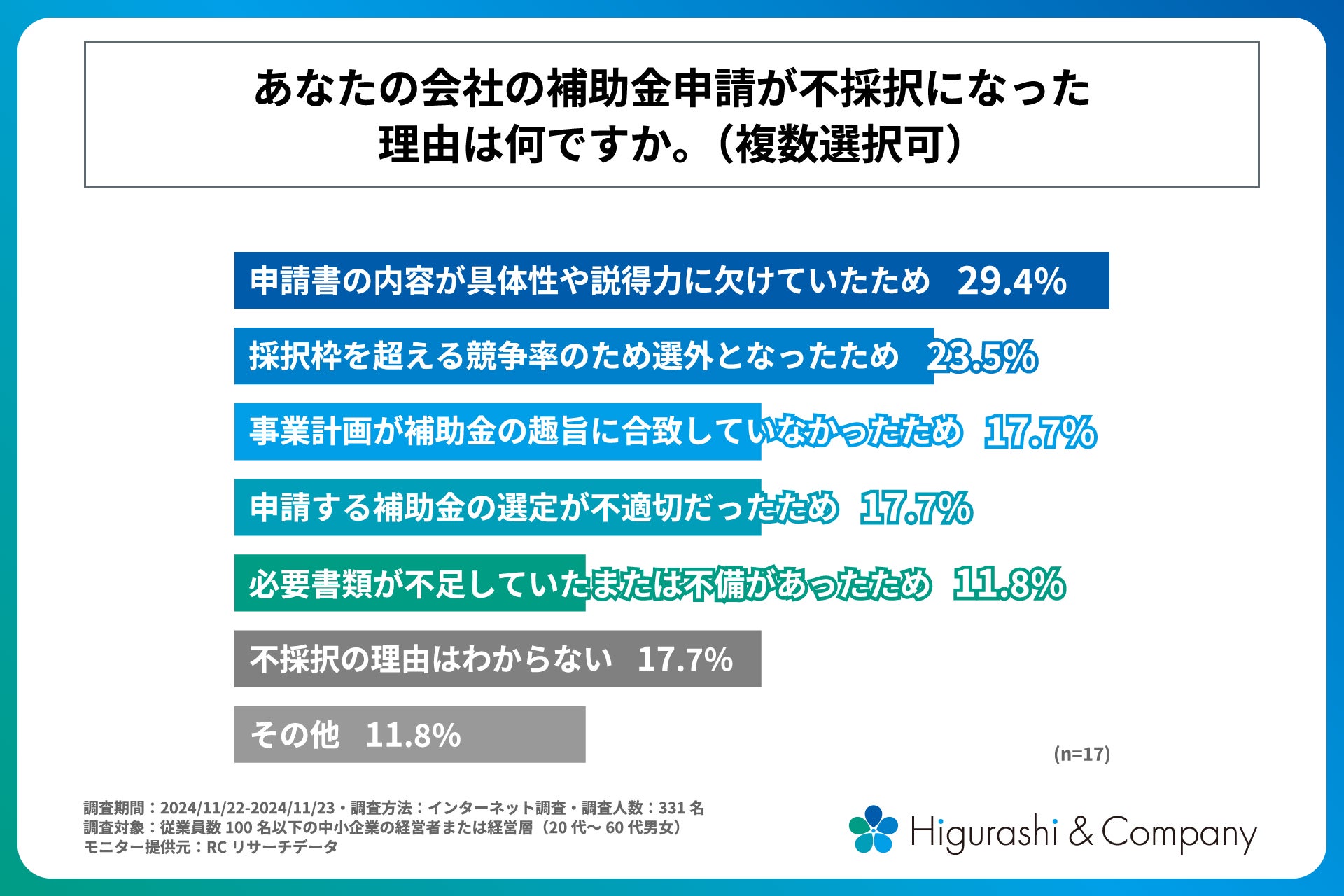 次に、補助金申請が不採択となった経験がある方に「会社の補助金申請が不採択になった理由は何か」を問う設問では、1位が「申請書の内容が具体性や説得力に欠けていたため」で29.4%、2位が「採択枠を超える競争率のため選外となったため」で23.5%となりました。この結果から、不採択になった理由として、自らの申請内容に不十分な点があると考えている人が多いことが明らかになりました。