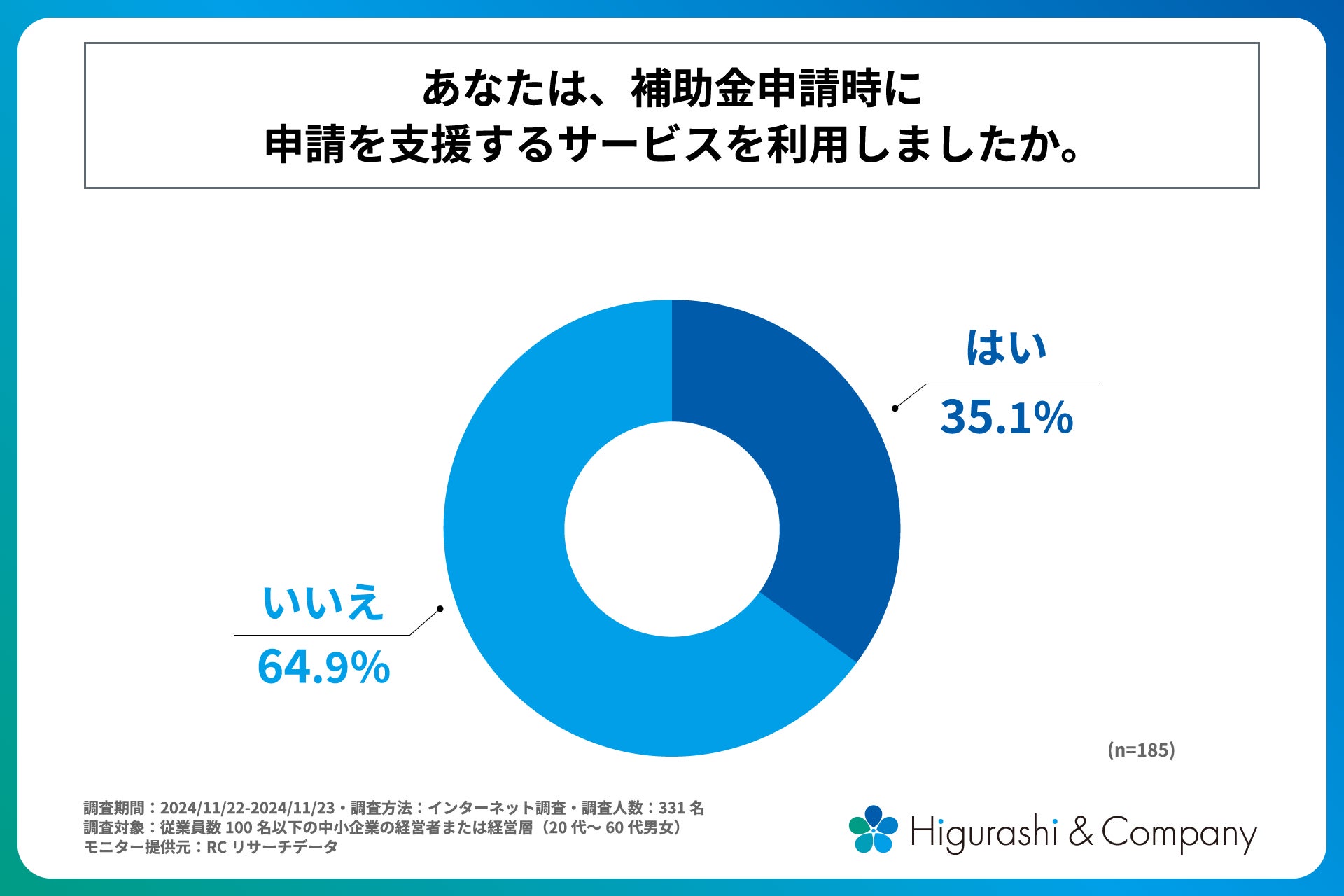次に、過去に補助金申請を行ったことがあると回答された方に「補助金申請時に申請を支援するサービスを利用したか」を問う設問の回答では、「いいえ」が64.9%、「はい」が35.1%という結果になりました。この結果から、補助金申請にあたって申請を支援するサービスを利用した中小企業の割合は3割強であることがわかりました。