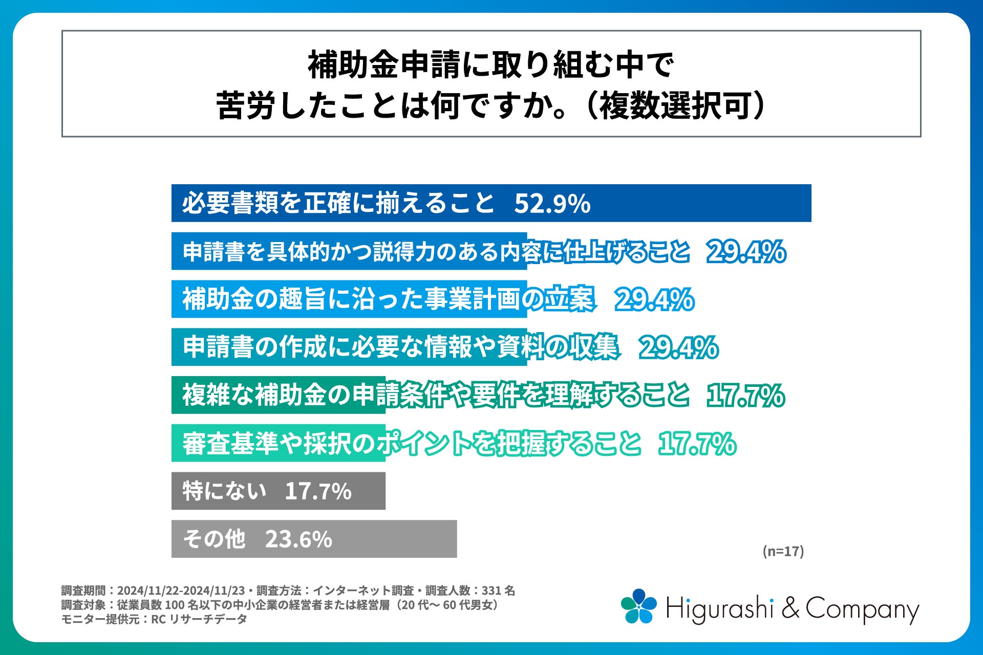 また、補助金申請が不採択となった経験がある方に「補助金申請に取り組む中で苦労したことは何か」を尋ねる設問への回答で多かったのは、1位が「必要書類を正確に揃えること」で52.9%、2位としては「申請書を具体的かつ説得力のある内容に仕上げること」、「補助金の趣旨に沿った事業計画の立案」、「申請書の作成に必要な情報や資料の収集」の3つが同率29.4%で並ぶ結果となりました。この結果から、中小企業が補助金を申請する上では様々な面で苦労があることがわかりました。