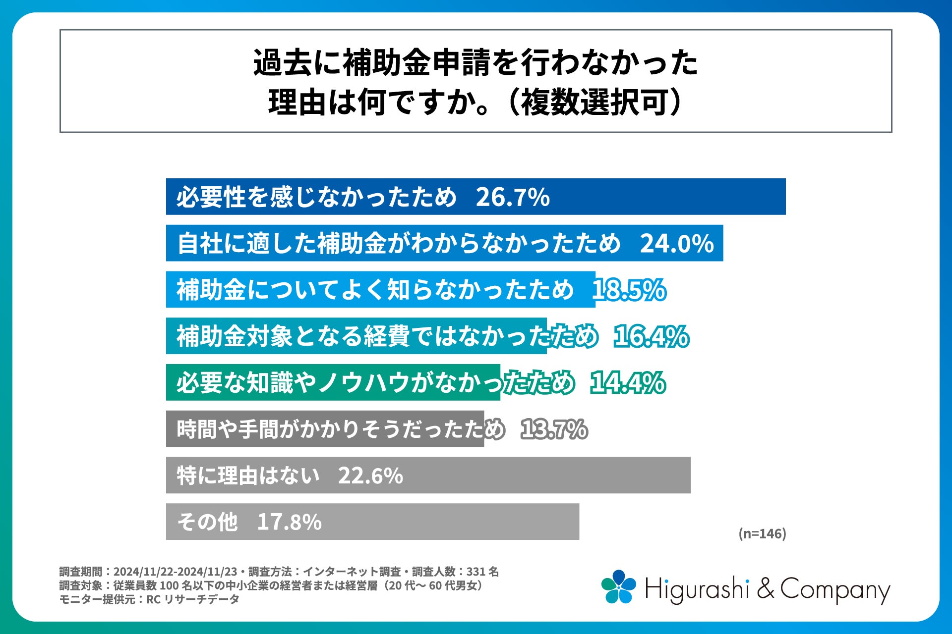 調査の最後、過去に補助金申請を行った経験がないと回答された方に「過去に補助金申請を行わなかった理由は何か」を尋ねる設問への回答で多かったのは、1位が「必要性を感じなかったため」で26.7%、2位が「自社に適した補助金がわからなかったため」で24.0%、3位が「特に理由はない」で22.6%、4位が「補助金についてよく知らなかったため」で18.5%という結果になりました。この結果、必要性を感じなかったために補助金申請を行わなかった中小企業も多い一方で、特に2位~4位になった回答からもわかるように、情報不足のために補助金申請を行わなかった中小企業が多くある、ということが明らかになりました。