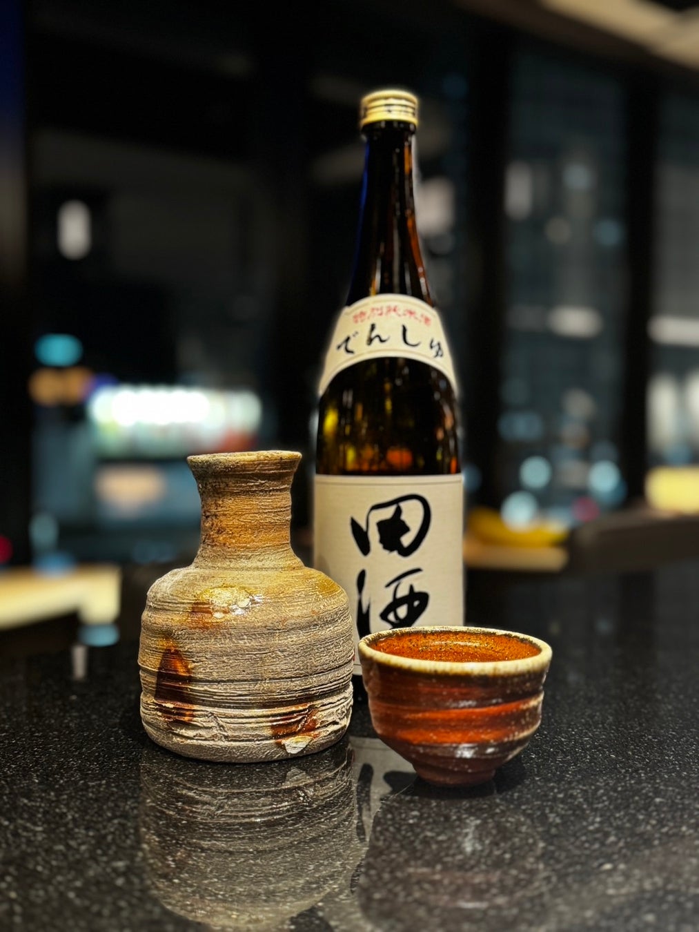 「BAR THE BLUE」のカウンター席で、青森ブルーが光る行燈のもと、千年後も感動を生む器と称される今井理桂先生の作品にて、日本酒・田酒の豊かな風味をお楽しみください。