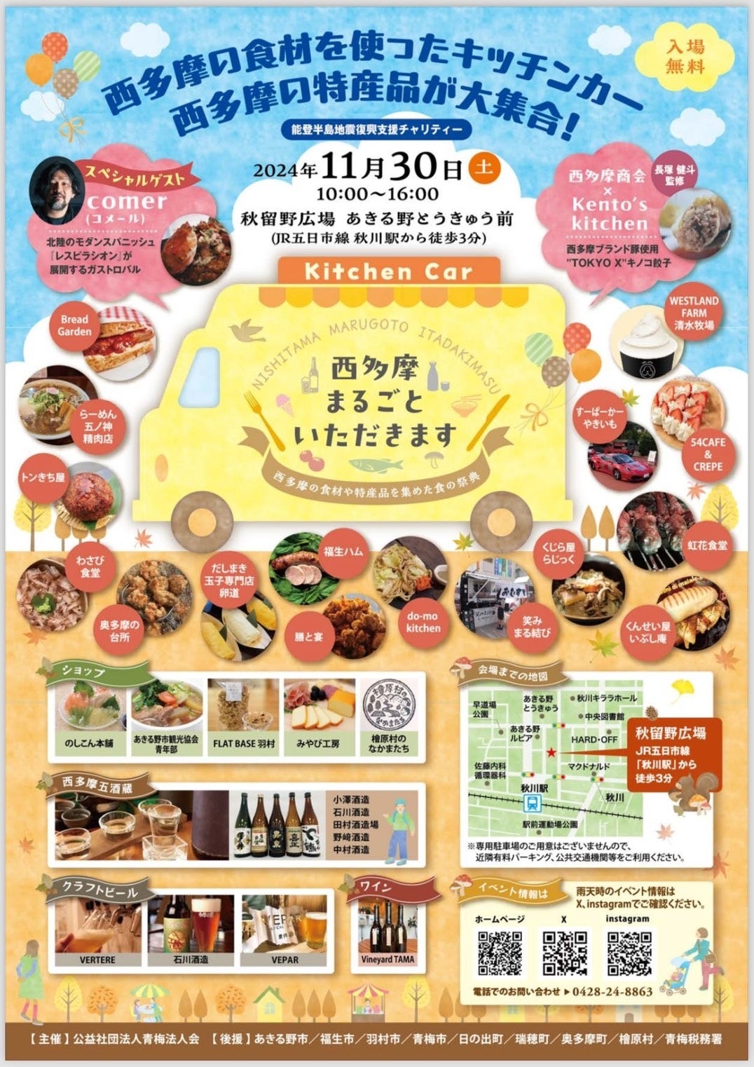 当日は、隣接した「秋留野広場」で西多摩の食材を使った料理を提供するキッチンカーや西多摩の5酒蔵の日本酒、西多摩のクラフトビールを提供する食フェス「西多摩まるごといただきます」も同時開催。