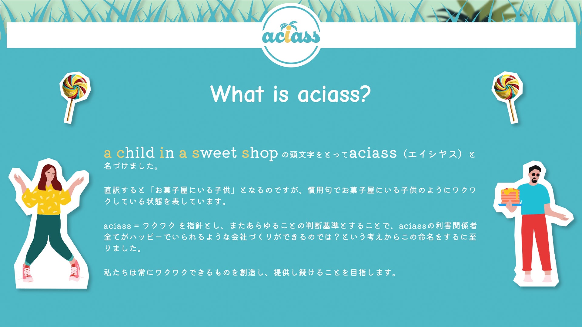 aciass = ワクワク を指針とし、またあらゆることの判断基準とすることで、aciassの利害関係者全てがハッピーでいられるような会社づくりができるのでは?という考えからこの命名をするに至りました。