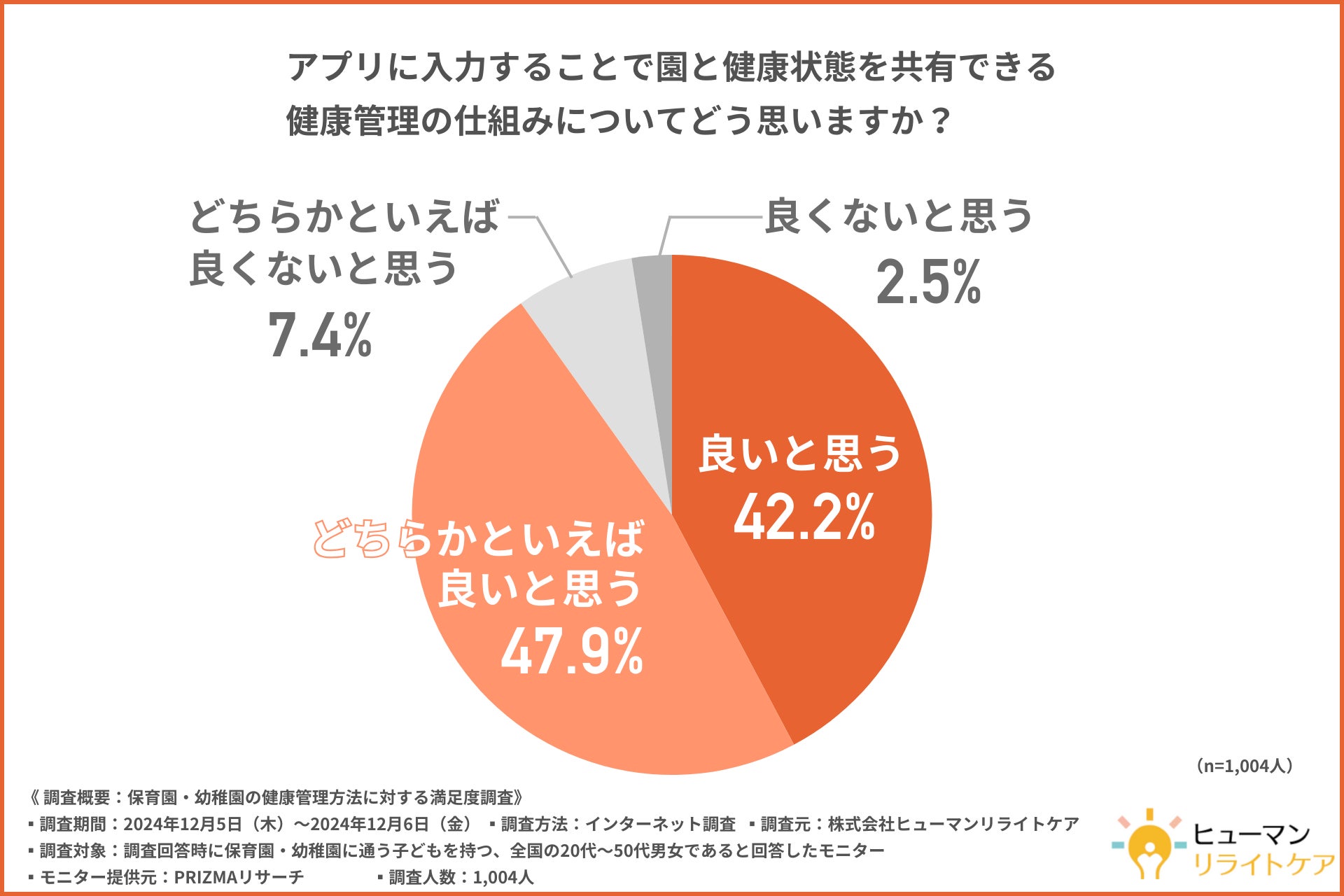 「アプリに入力することで園と健康状態を共有できる健康管理の仕組みについてどう思いますか?」と質問したところ、約9割の方が『良いと思う(42.2%)』『どちらかといえば良いと思う(47.9%)』と回答しました。