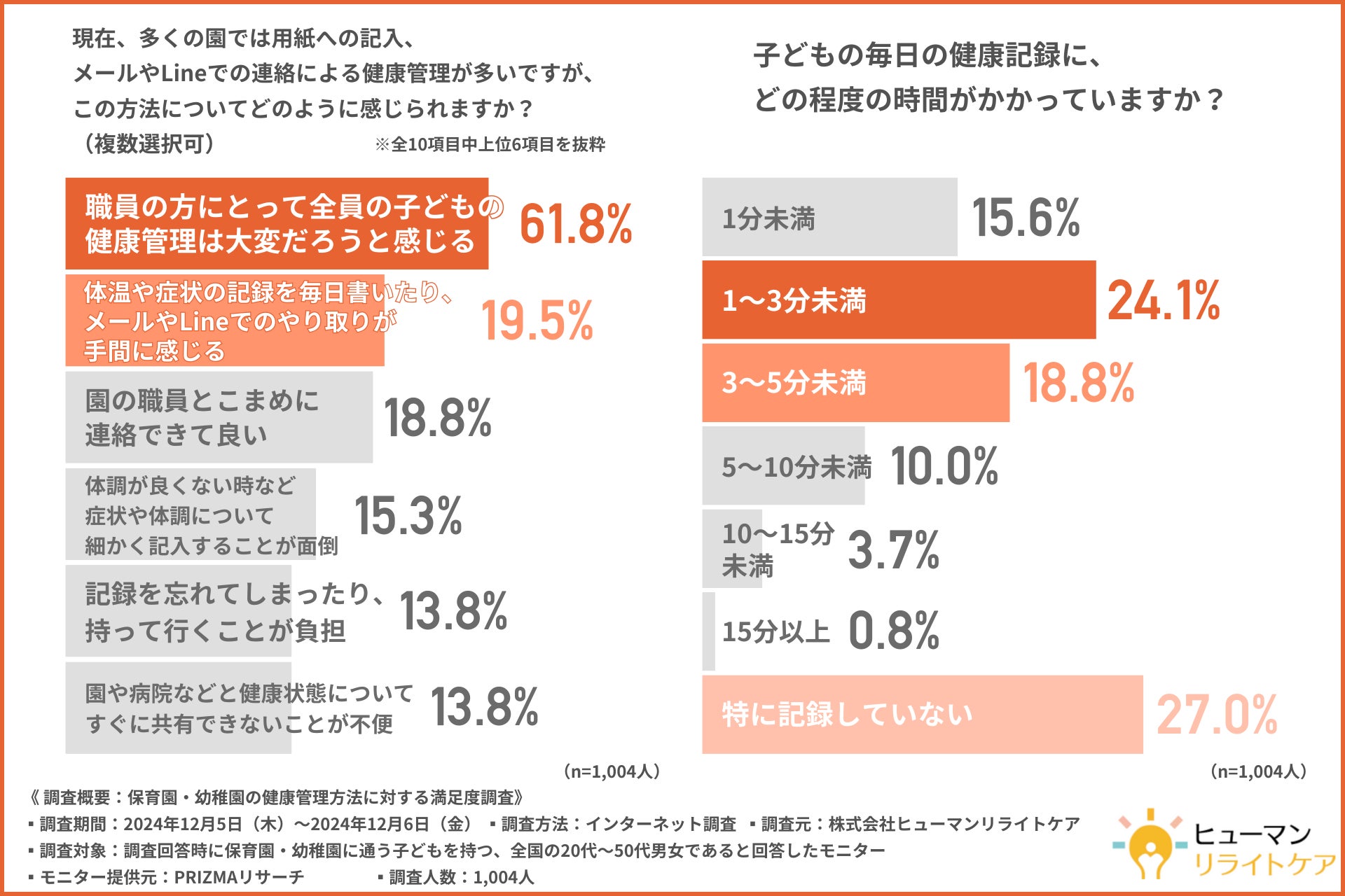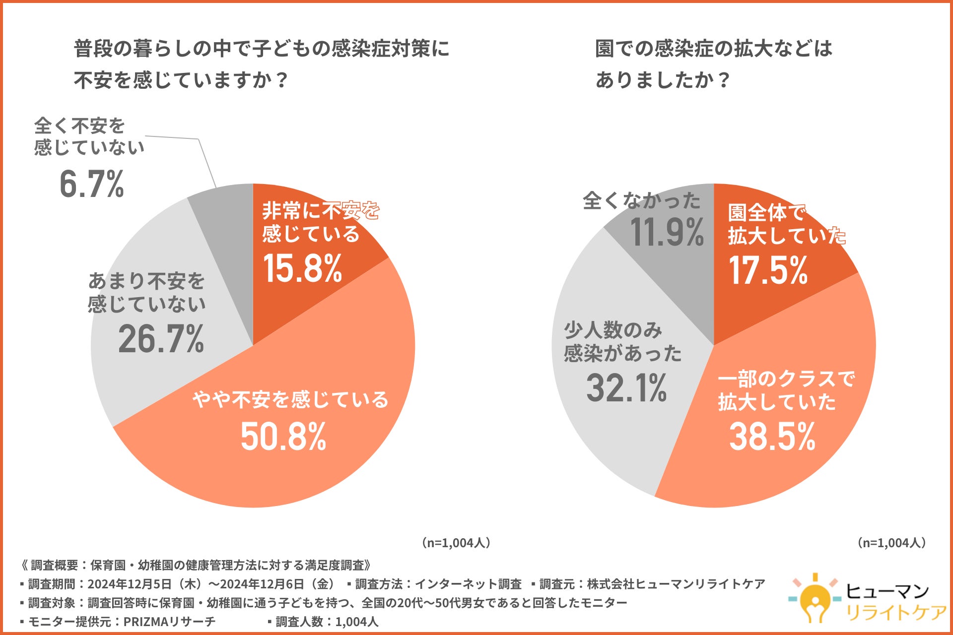 株式会社ヒューマンリライトケア(所在地:東京都練馬区、代表取締役:田近 郷)は、保育園・幼稚園に通う子どもを持つ、全国の20代~50代男女を対象に、保育園・幼稚園の健康管理方法に対する満足度調査を行いました。