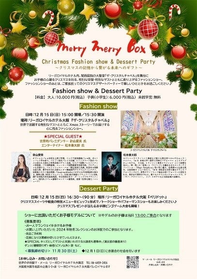 リーガロイヤルホテル内、関西屈指の大聖堂「ザ・クリスタルチャペル」を舞台に、お子様の心躍るクリスマスを彩る、特別な空間・特別なゲストとともに創り上げるファッションショー。ファッションショーのあとは、ご家族揃ってのクリスマスデザートパーティーで楽しいひとときをお過ごしください‼