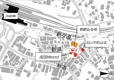 成田の表参道の裏手には、かつて栄えた新道通りがあります。新道通りのある花崎町エリアは、起伏があり細い道が多いのが特徴です。古くからの街並みを残すこのエリアは、空き家が増えつつあるのが現状で、その街並みの再生のために、新道通り沿いの空き家三軒を活用する「成田Meets!」というプロジェクトが始まりました。