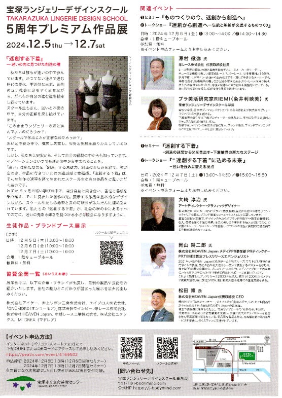 宝塚ランジェリーデザインスクール(所在地:兵庫県宝塚市、学長:ブラ美活研究家RIEMI/粂井利映美)は、開校5周年を記念し、宝塚市文化芸術センターにてプレミアム作品展を開催する。2024年12月5日(木)~7日(土)の3日間にわたって行われる同作品展では、スクール在校生・修了生22名の作品展示、同校講師・著名デザイナーの作品展示、下着関連企業の特別ブースなどが一堂に会する。また、5周年記念プログラムとして、資材メーカートップや下着製造販売会社社長、ブランディング・PRのスペシャリストなどの豪華なゲストを招いた、トークショーやセミナーの特別イベントも会場にて同時に開催。混とんとした時代の中で、迷いから創造を生む過程、下着業界の次なるステージの予測など、多様なアプローチで未来の下着業界につなげるヒントを投げかける。
