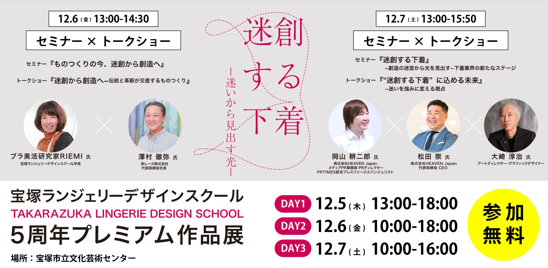 3日間のプレミアム作品展のうち、12月6日(金)、12月7日(土)の2日間は、下着業界を牽引する資材メーカーのトップ、下着製造販売会社社長、ブランディング・PRのスペシャリストなど、豪華な顔ぶれのゲストが登場。『迷創する下着』をテーマにしたオリジナル講演を行う。