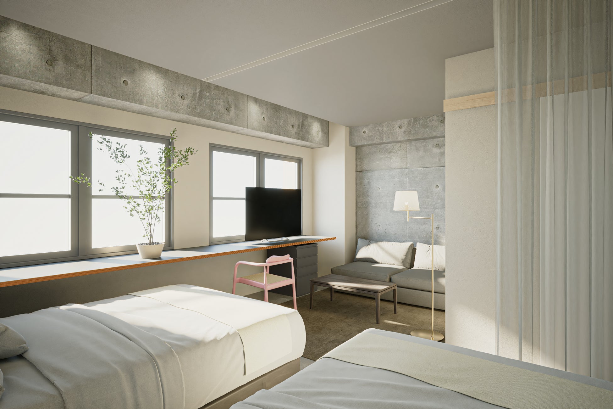 30㎡以上の広い部屋を中心に、全67部屋をご用意いたします。建築物の床や壁面が持つ時間の流れをデザインの一部として取り込み、洗練された家具、照明で空間を上書きし、しっとりとした上品な宿泊体験をご提供します。窓際に5m越えのカウンターテーブルを配し、様々なニーズに対応できるように配慮しています。
