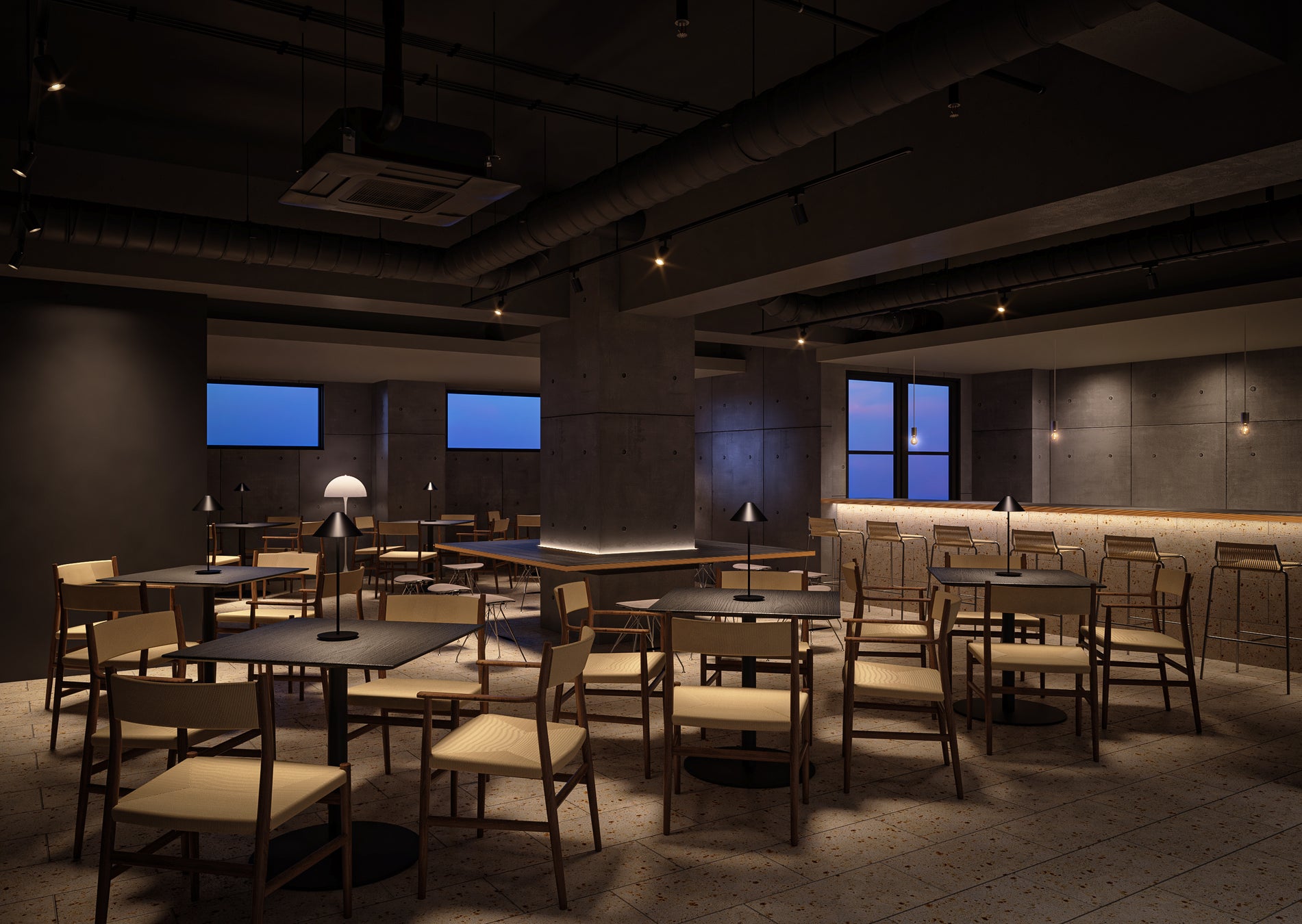 3階フロントロビーと一体化した「TONES LOUNGE」はゲストにブレックファストを提供する場であり、地域の個性を味わえるお酒や軽食を愉しめる場としても機能します。既存の柱をスケルトン化し象徴的に再利用、安らぎを誘発する照明デザインにより、この空間の時の流れを演出します。