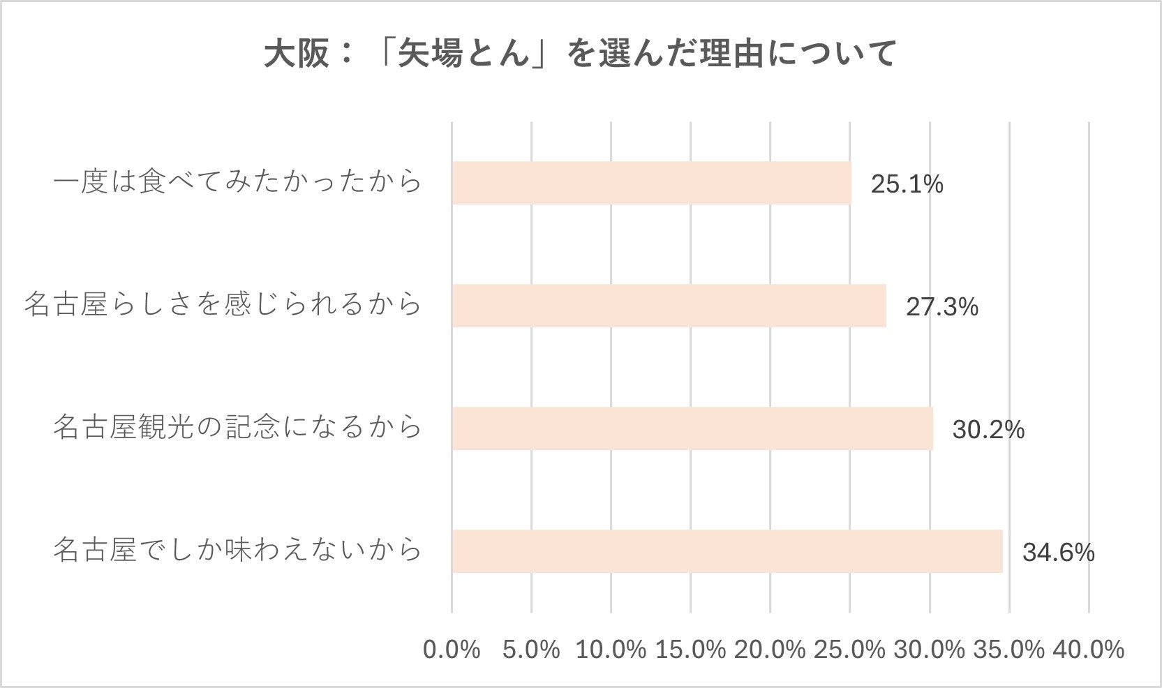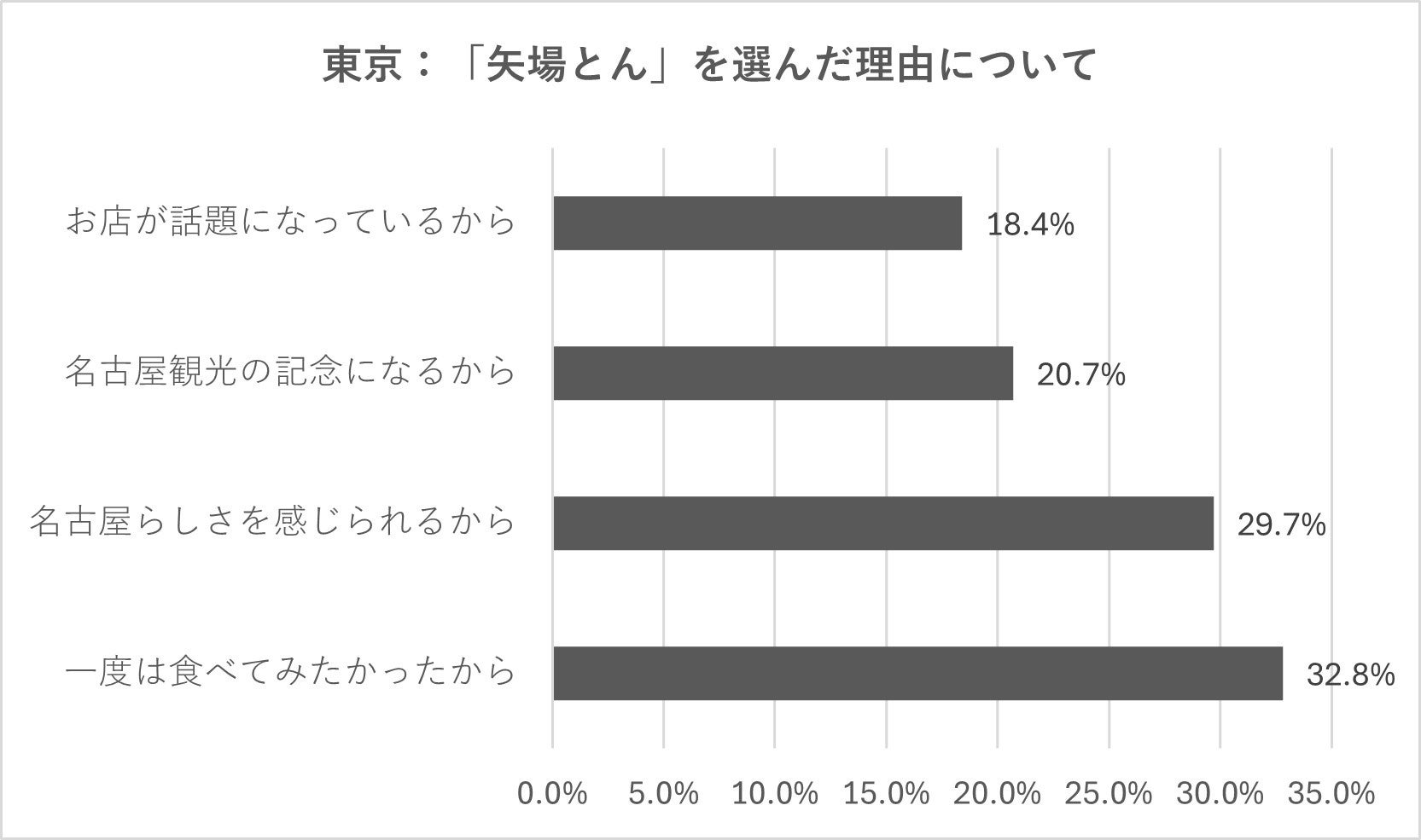 また、名古屋めし店舗の中でも「矢場とん」を選ぶ理由として、大阪では東京と異なり「名古屋でしか味わえない」が34.6%、「名古屋観光の記念になるから」が30.2%となった。また「名古屋観光の記念になるから」に関して、東京と比べて大阪が10%以上高い結果となり、大阪では、「矢場とん」に対して身近なイメージではなく、“名古屋めし”のイメージが強いことがわかった。