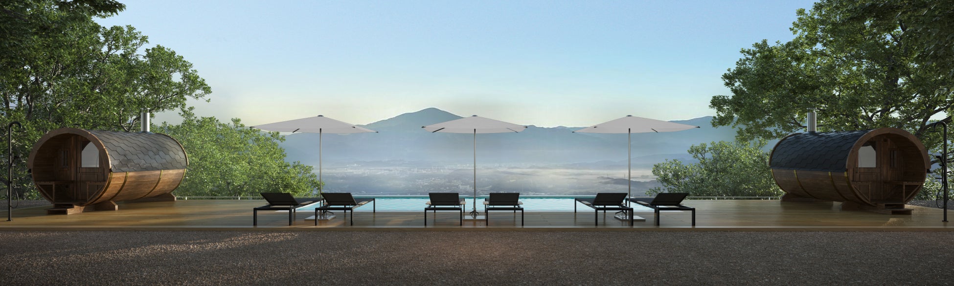パノラマビューを見ながら楽しめる、プールとバレルサウナで、より寛ぎの時間をお楽しみいただけます。春は桜、秋は紅葉といつ訪れてもその時期の豊かな自然を楽しめる空間を目指しています。