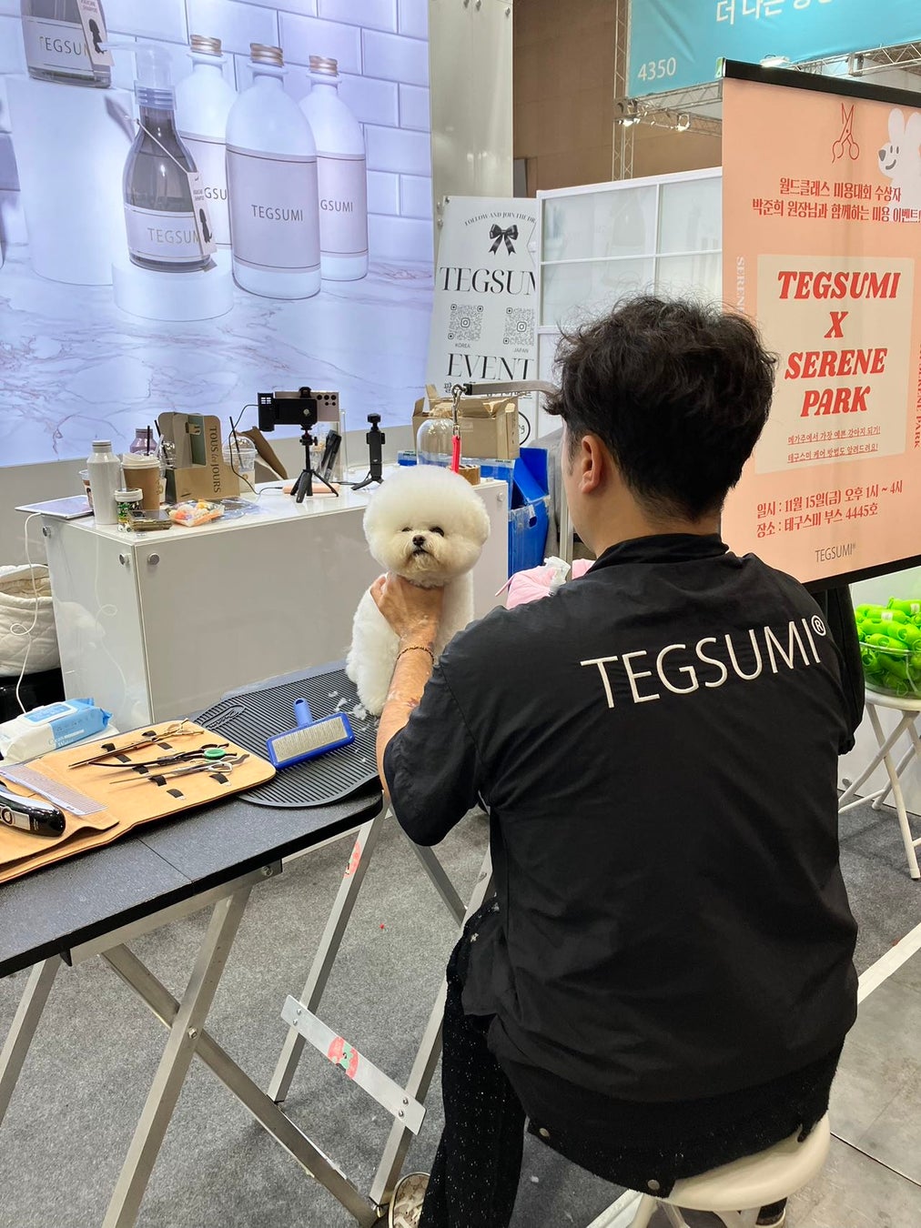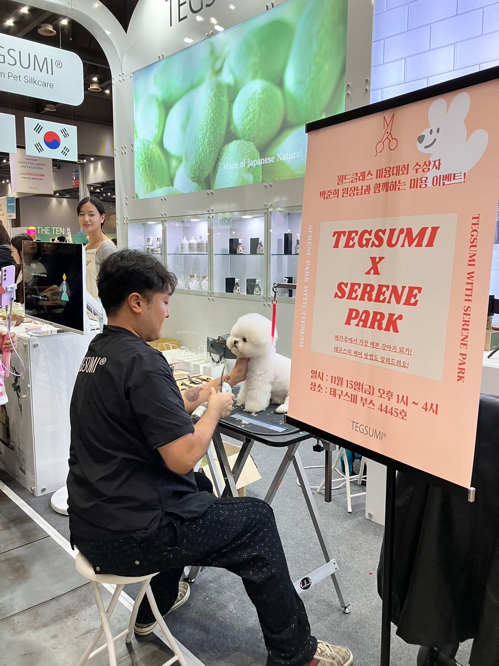 TEGSUMIブースでは韓国内外で著名なトリマー「SERENEPARK」×TEGSUMIのコラボを行い、美容ショーを開催。