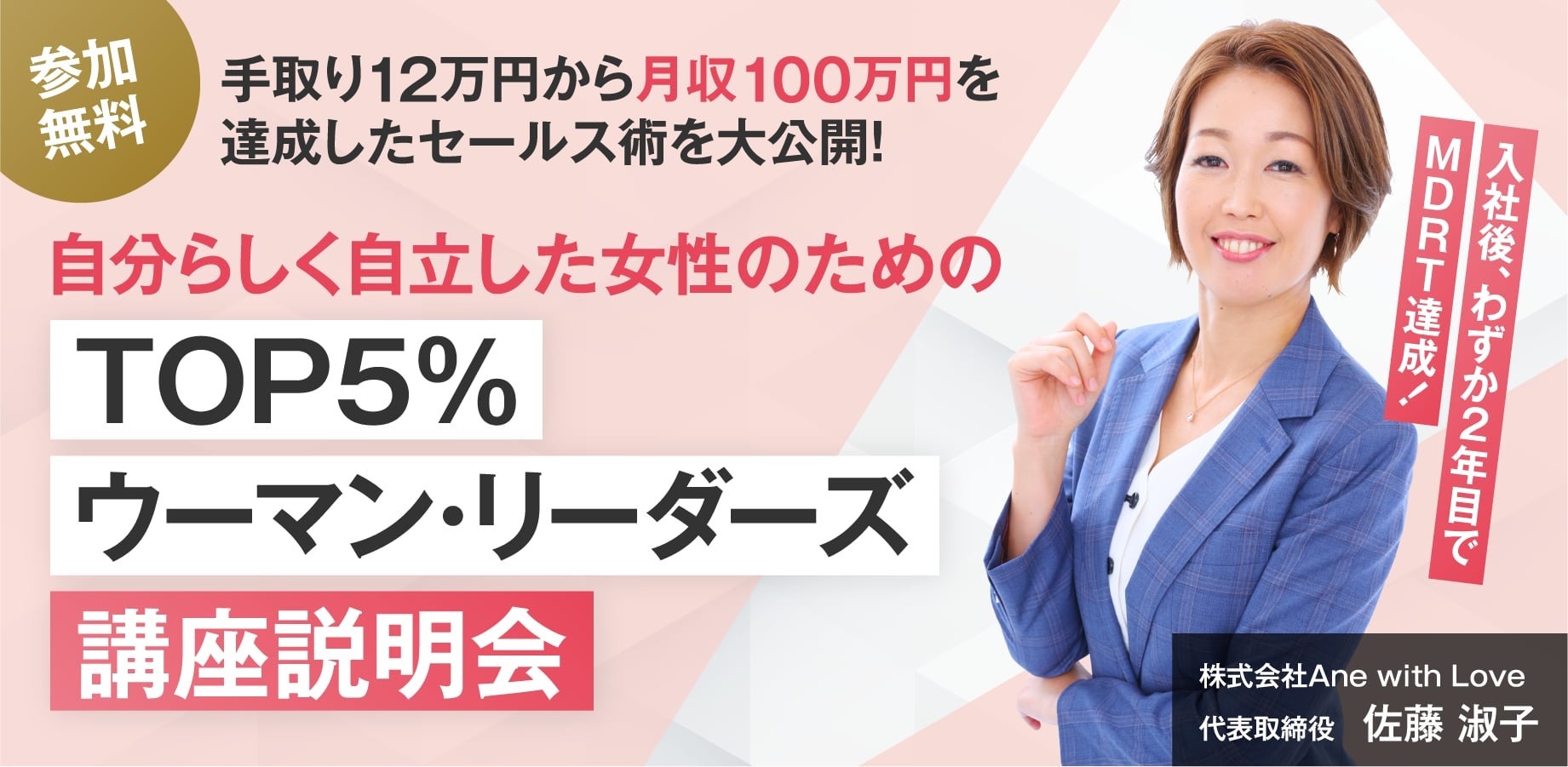 2年目にしてMDRTを達成し、世界上位5%のセールスパーソンとなった佐藤淑子氏による、女性のためのセールス力UPセミナー無料開催決定!
