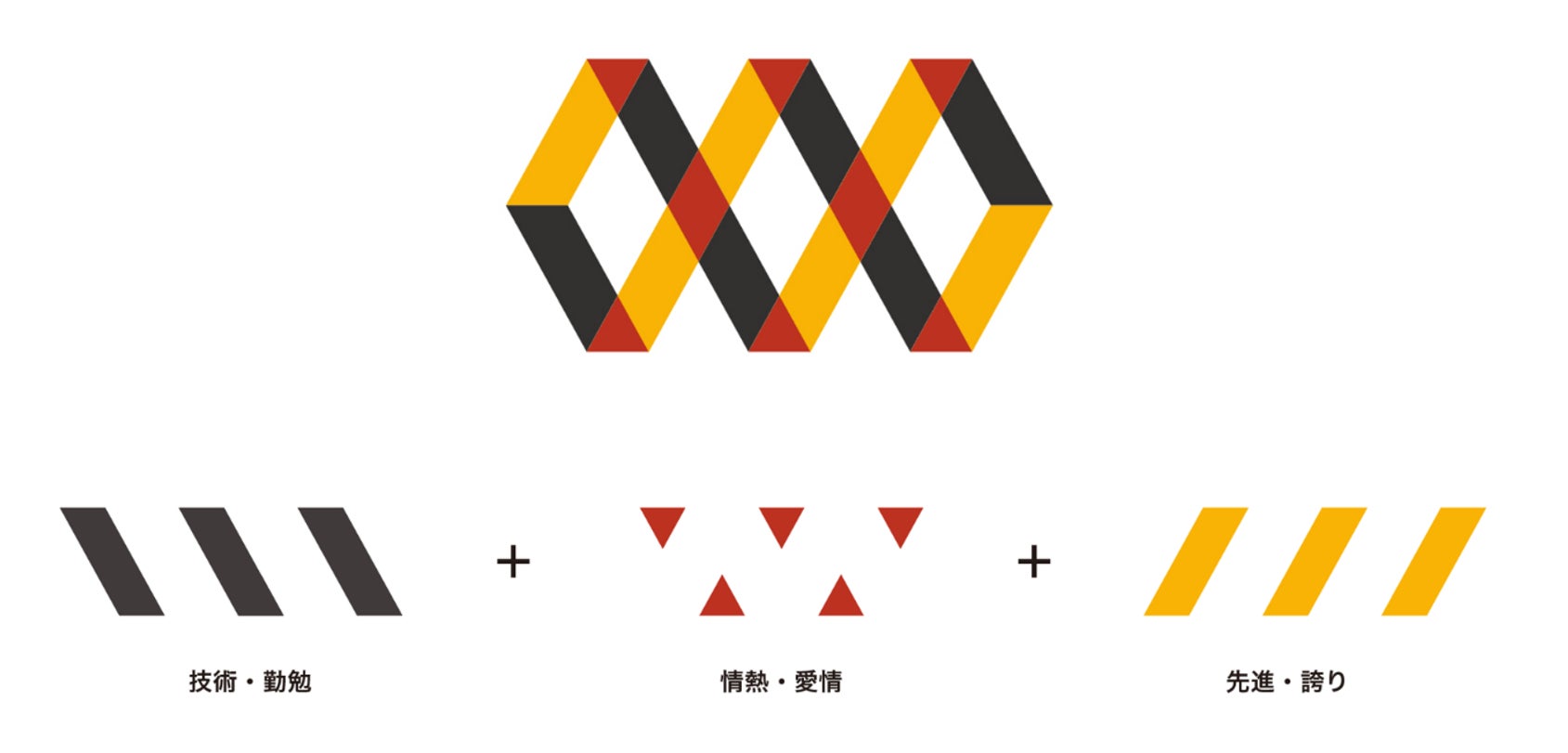 今回のリブランディングでは、新しいブランドロゴを制作しました。このロゴは、ドイツの伝統家屋を象徴する「大屋根」と、私たちが大切にする価値観である「勤勉」「情熱」「先進」を三角形のモチーフで表現しています。