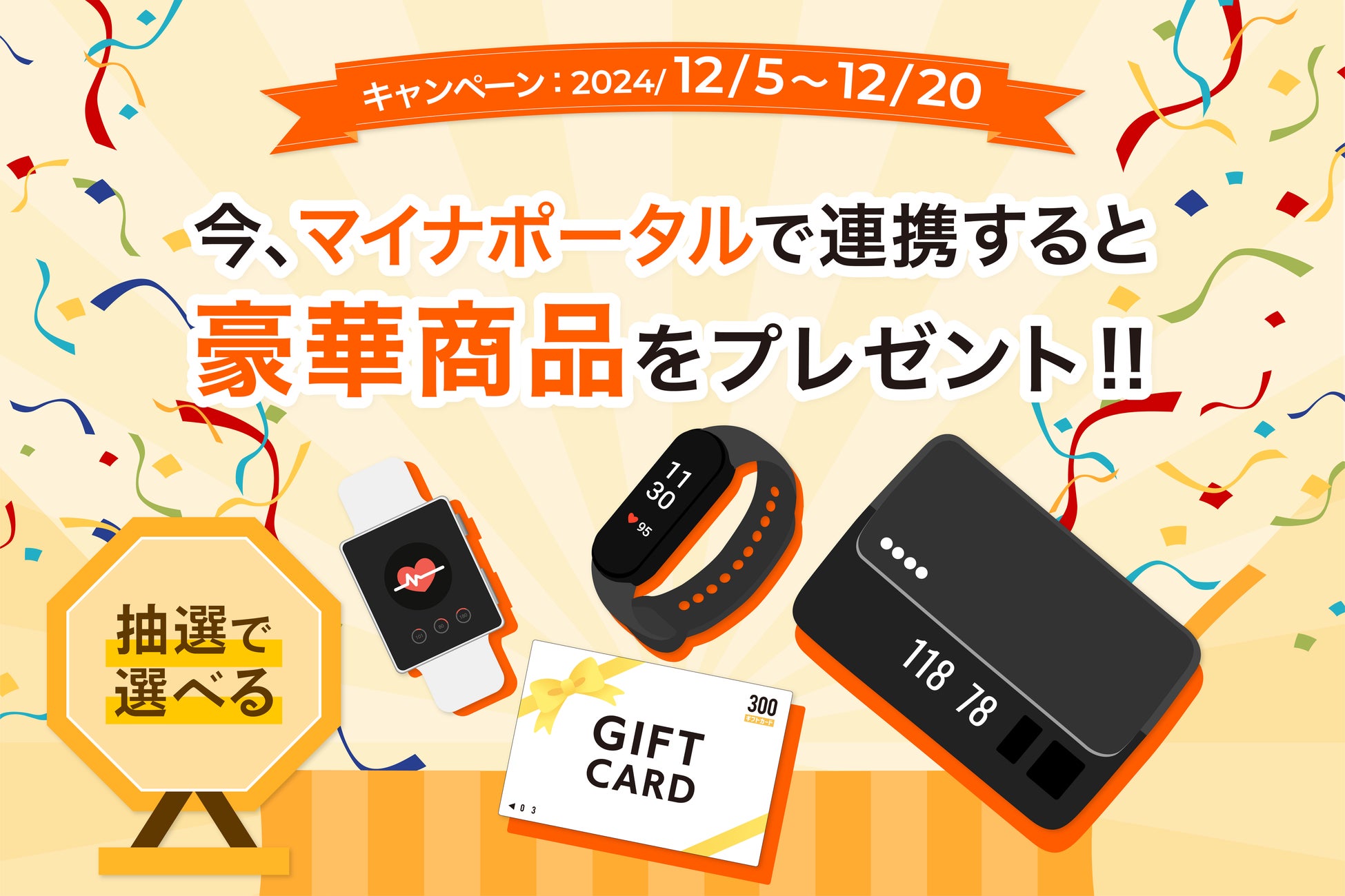 本キャンペーンでは、マイナポータルを活用して健康データを管理する患者を支援し、健康に役立つ商品を抽選でプレゼントいたします。この機会にぜひお試しください。
