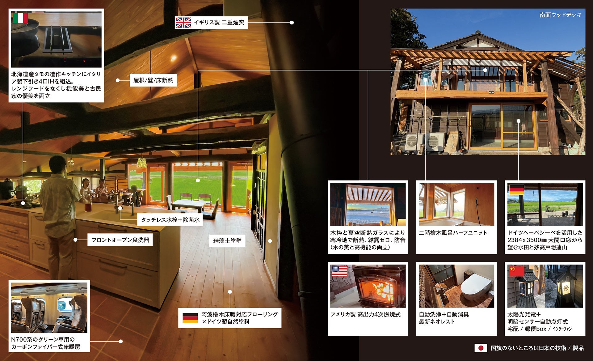 世界最先端の機能美と古民家の優美の新結合が産んだ美しく快適な空間を創り出します。例えば、2階のキッチンエリアの空間を美しく有効活用すべく、レンジフードを使わず、下引きのIHを導入しました。イタリアfalmec社製四つ口のIHは、機能性とデザイン性が共に優れ、IHのフェラーリと称するにふさわしいもので、日本に一台しかないものです。木枠にこだわった外窓は、全て日本板ガラス社製の真空断熱ガラス窓です。世界初の技術で、ペアガラスやトリプルガラスのような厚みは必要とせず、木枠に美しく収まります。寒冷地でありながら、断熱、防音ともに極めて優れ、結露も全くありません。2階のLDKに導入した床暖房は、カーボーンファイバー式で、東海道新幹線のグリーン車のフットレストで使用されているものです。