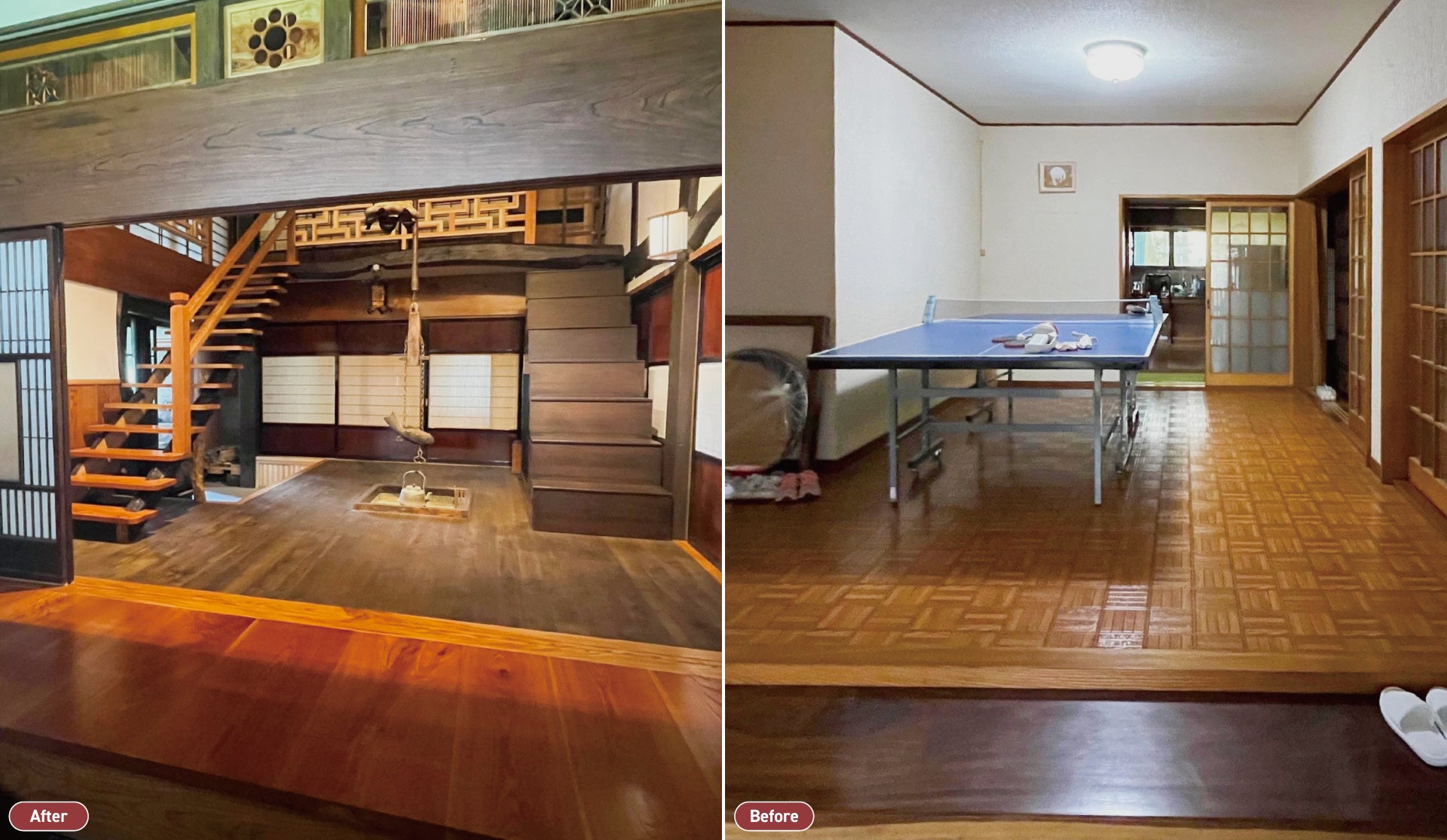 承継樓では、昭和40~50年代のリフォーム時にビニールクロスで覆われたり、隠されたりしてしまった、立派な欅の柱や梁や茅葺を現しにしました。また、昭和時代に失われた囲炉裏を復活させ、網代天井、火灯窓、下地窓、法隆寺の欄干と角擬宝珠などの伝統造作を新設しました。