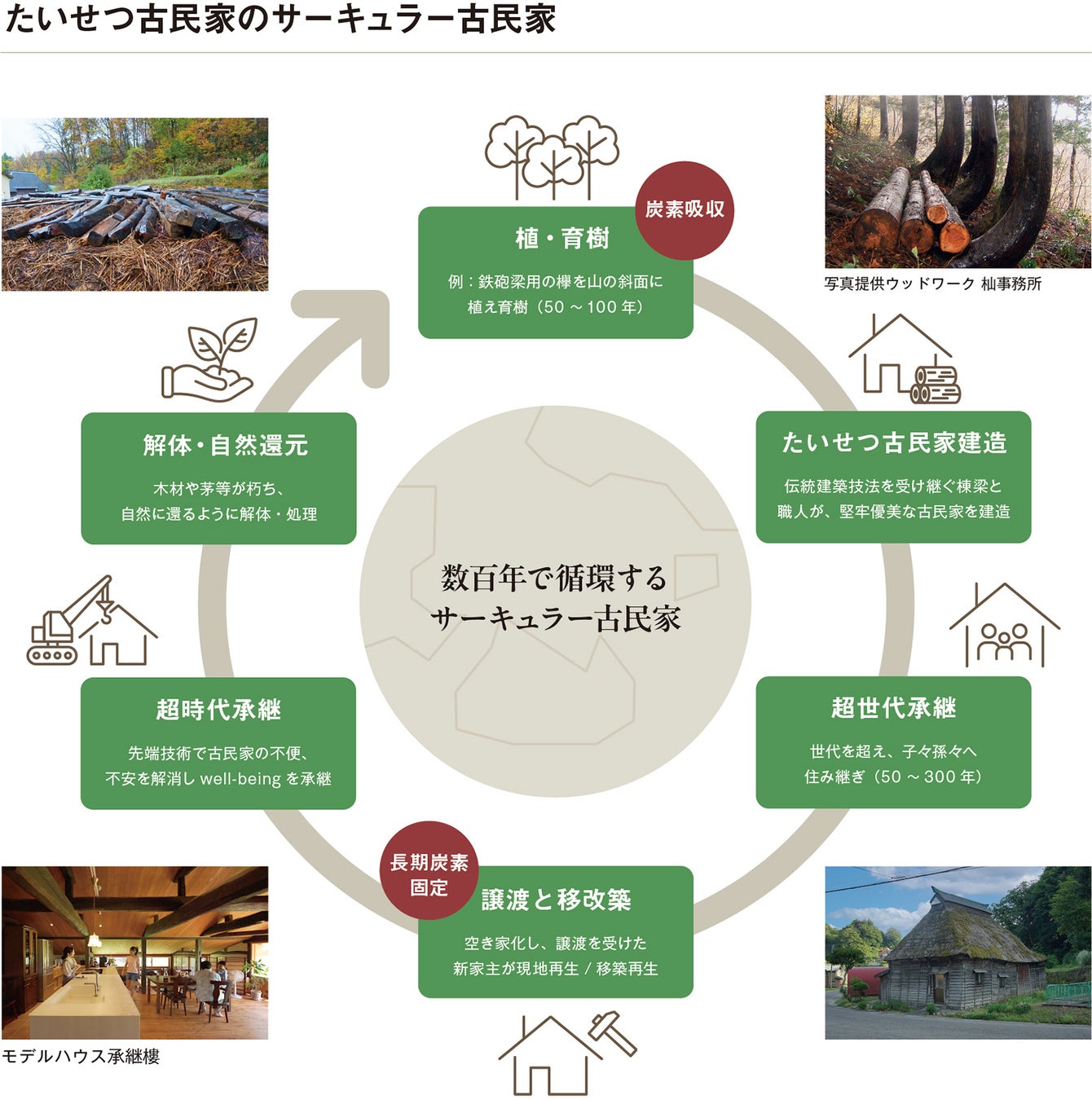 上のサーキュラー古民家の循環は、植・育樹の炭素吸収から始まり、炭素の長期固定を経て、解体・自然還元に至るまでの6つのステージをめぐります。そのなかで承継樓は、世代を超えて住み継がれてきた古民家を、時代を超えてシン・古民家として、更に長期に渡り、住み継ぐところに位置付けられます。